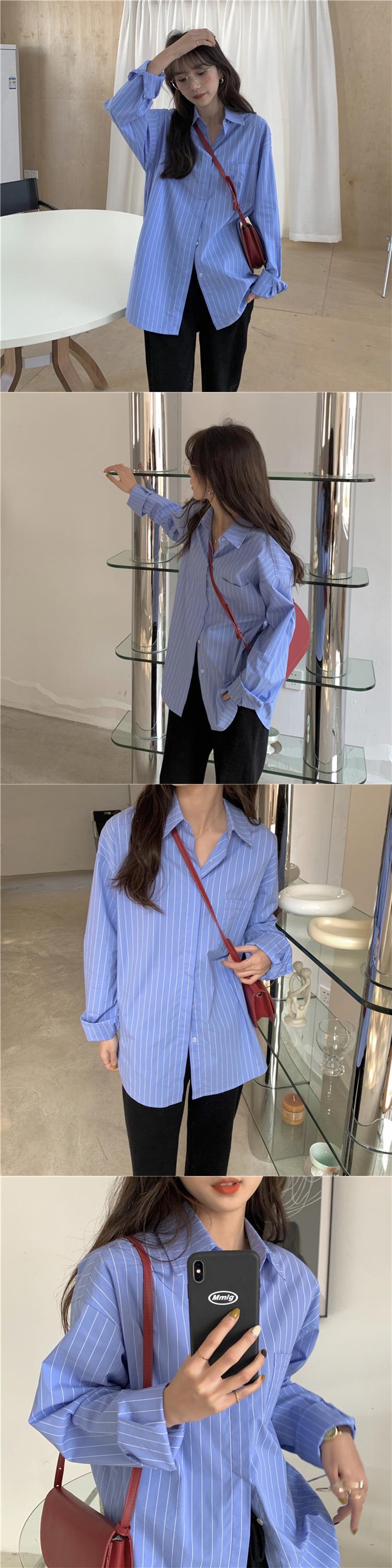 2021 最新作 ブルーストライプシャツ女性春秋新作縦縞ルーズバージョンスモールマンオールマッチスタッキングカジュアルトップス スプリング 春物 オータム 秋物 0178785476993