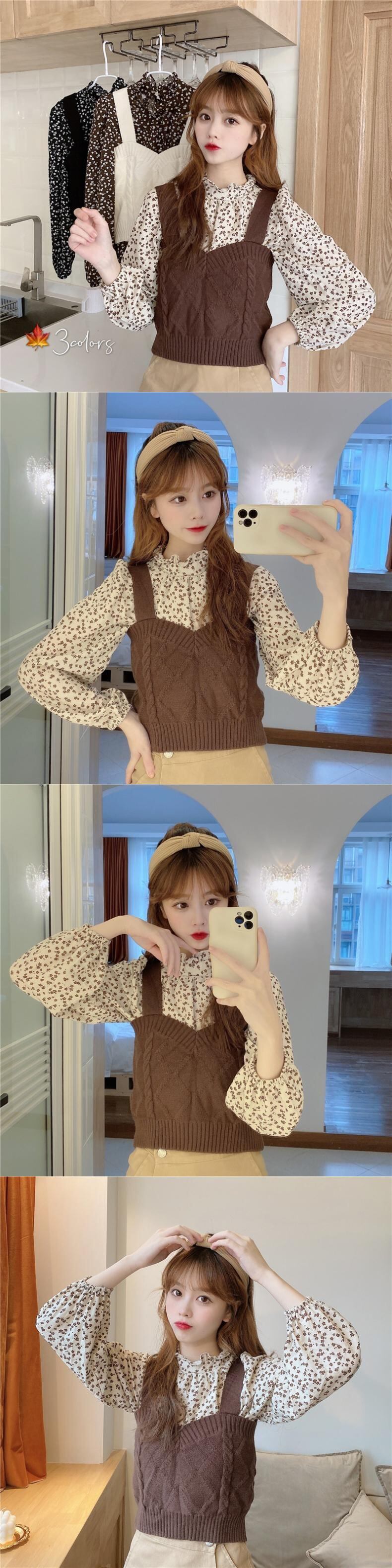 色:黒花柄シャツ,アプリコットフローラルシャツ,コーヒーカラーの花柄シャツ,ブラックニットベスト,アプリコットニットベスト,コーヒーカラーのニットベスト