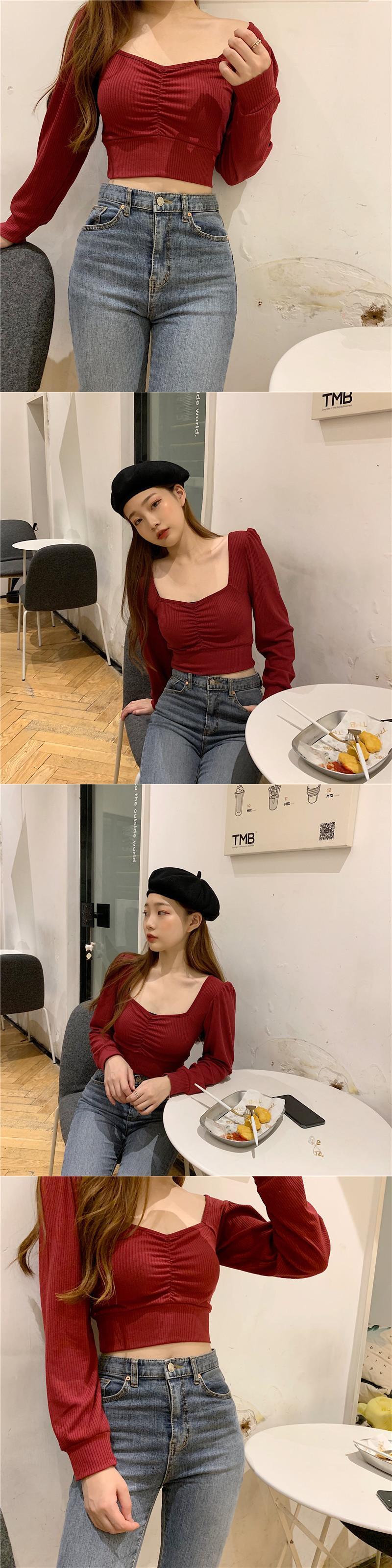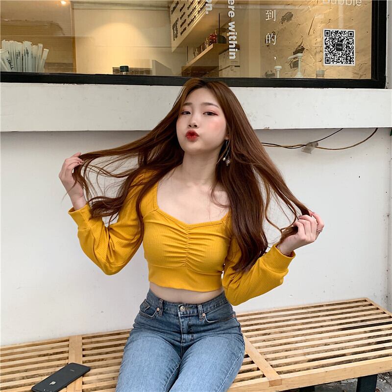 2021 最新作 春のレトロなフレンチスクエアカラーの漏れ鎖骨長袖Tシャツインスーパーファイアストレッチタイトショートクロップトップ婦人服 ロング スプリング 春物 スクウェア 0143439665353