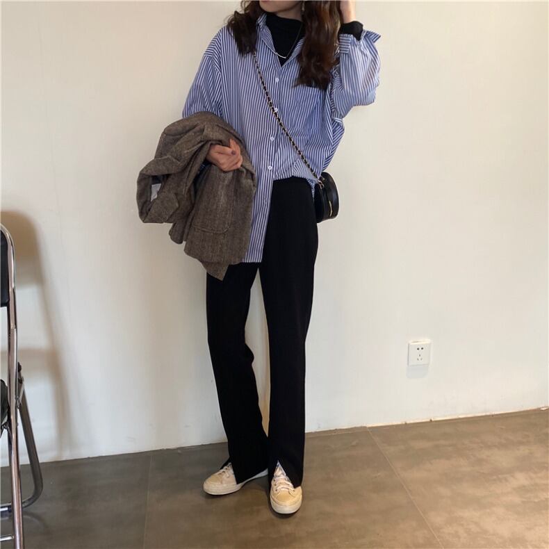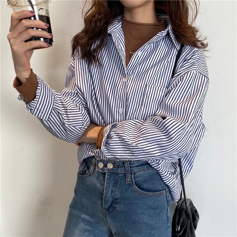 2021 最新作 2021年春の新作ブルーストライプシャツ女性デザインセンスニッチルーズミドル丈シャツレイヤード着用 レッド スプリング 春物 0115828386668