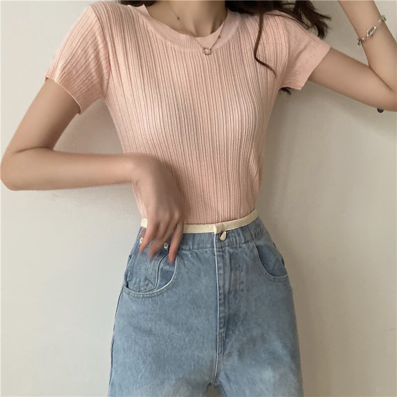 2021 最新作 アイスシルクニットセーター半袖Tシャツ女性の夏2021年新しいハイウエスト半袖スリムイエローショートトップ夏 サマー 夏物 0160159592226