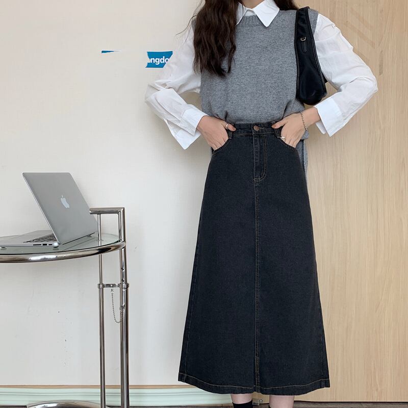 2021 最新作 ブラックデニムスカート春女性ミドル丈レトロパッケージヒップスプリットスカートハイウエストaラインスカートは細くてロングスカートでした スプリング 春物 0171939591554