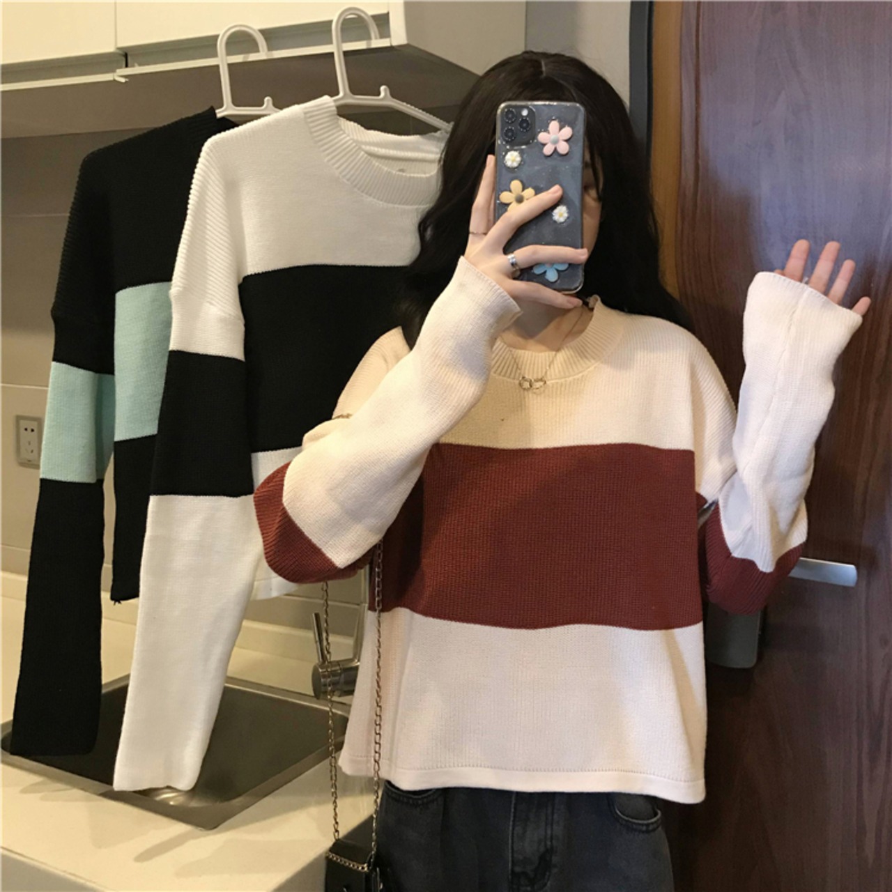 2021 最新作 2021年春の新しいショートニットトップレディース長袖カラーブロックセータールーズで用途の広いデザインのTシャツ ロング スプリング 春物 0122607404247 | deco2
