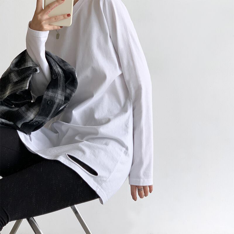 2021 最新作 2021年春秋新作リッピングホワイト長袖Tシャツレディースルーズトップス、ミドル丈ボトミングシャツレディース春 ロング スプリング 春物 オータム 秋物 0158210479338