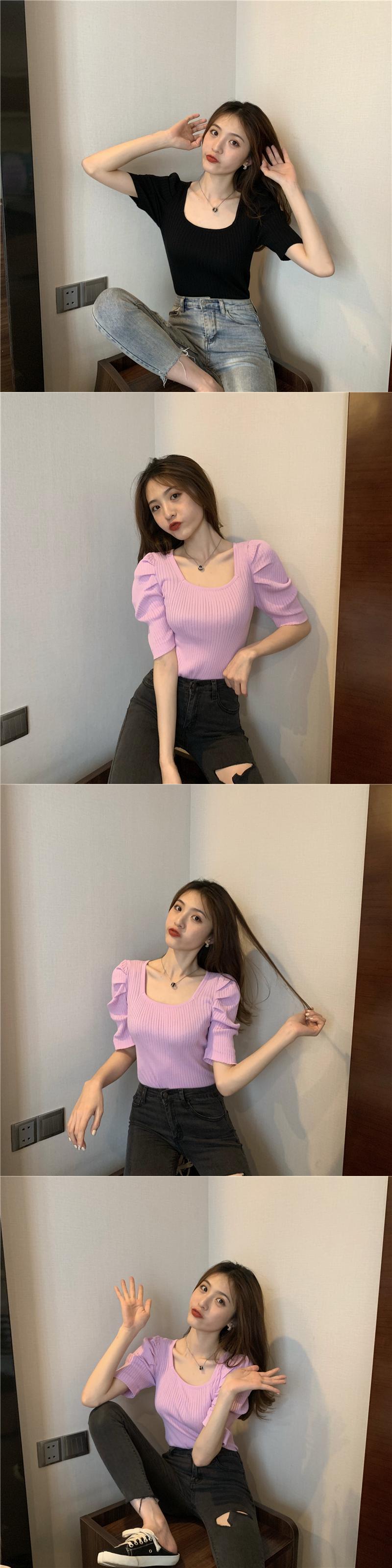 2021 最新作 半袖Tシャツ女性の2021年夏新しい半袖半袖ショートハイウエストパフスリーブレトロローネックフレンチスクエアカラートップ サマー 夏物 スクウェア 0198754741289