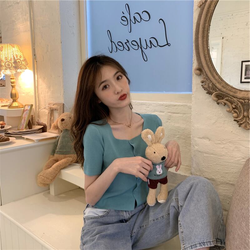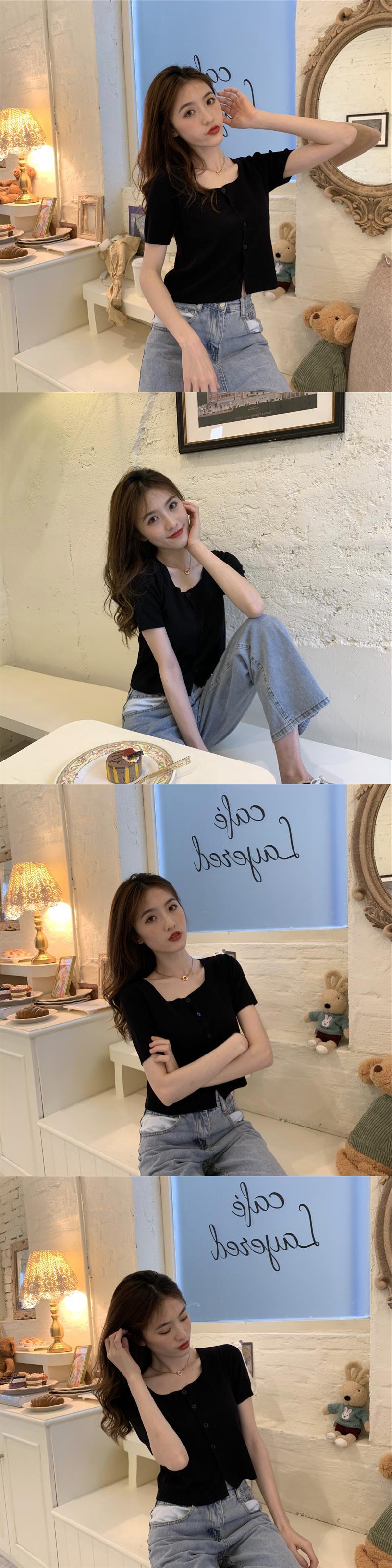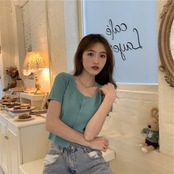2021 最新作 -ウエスト半袖Tシャツウィメンズタイド2021夏新作アイスシルクセーターセクシーおへそスクエアネックトップ ショート サマー 夏物 スクウェア 0133093817777