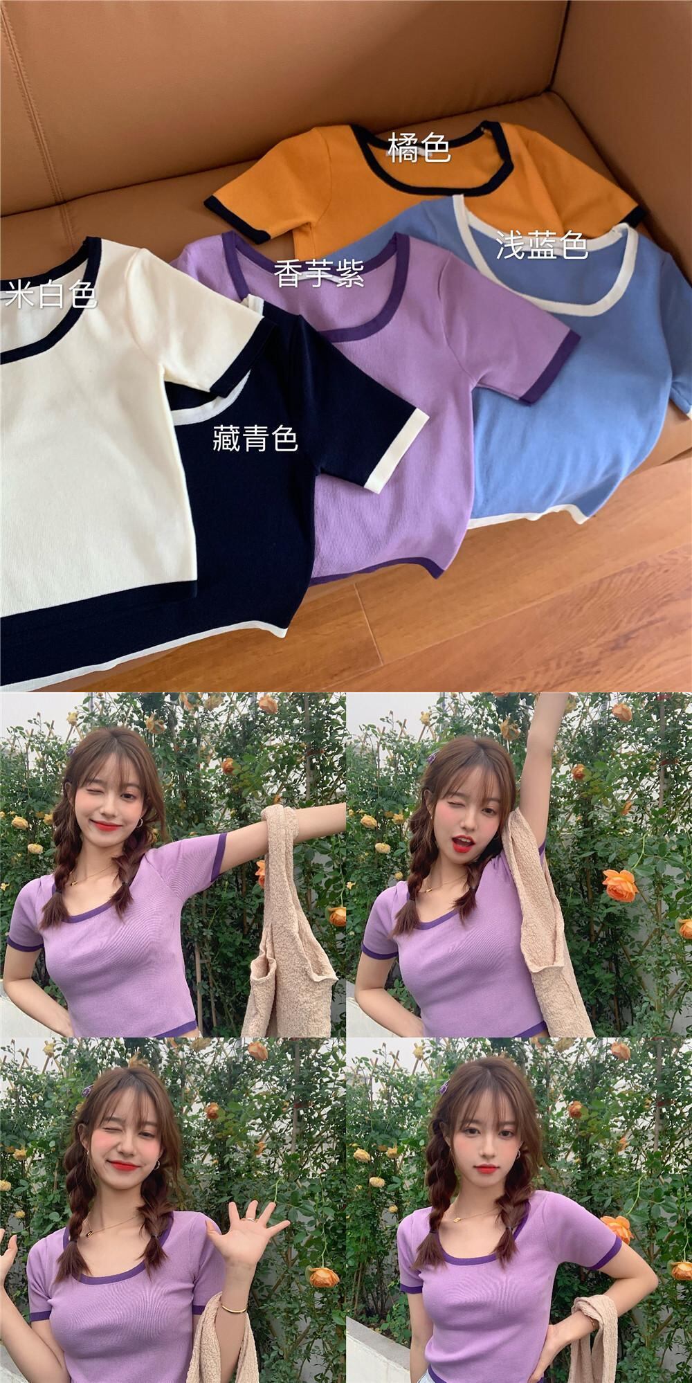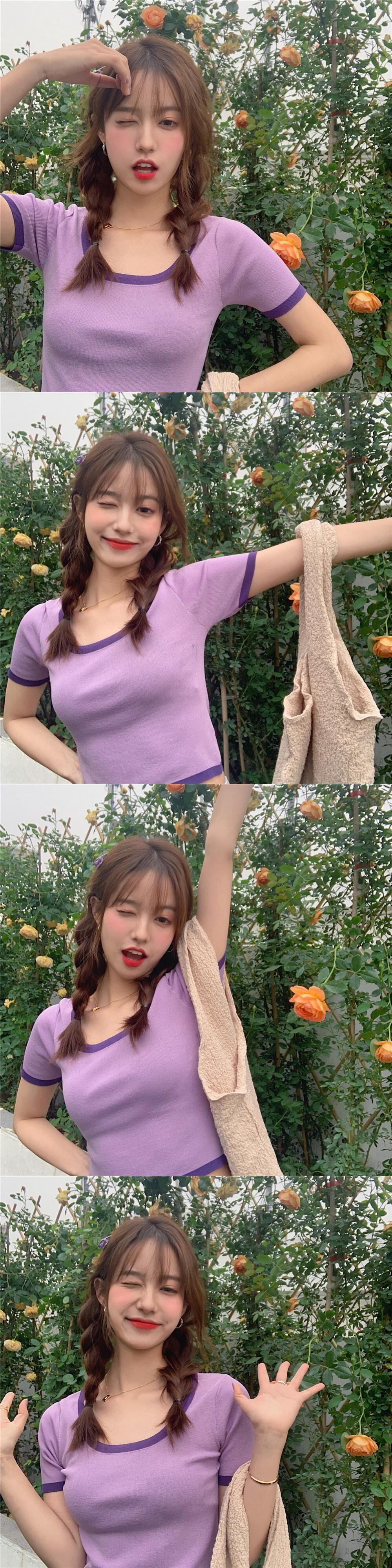 2021 最新作 パープル半袖Tシャツレディースショートネットレッドインスーパーファイアクローズアップ露出鎖骨丁寧なマシンニットトップス 0139021079303