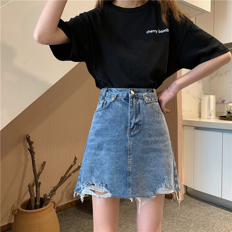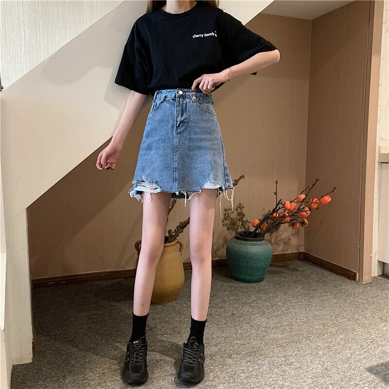 2021 最新作 ハイウエストのシックなスカートを着ているデニムスカートの女性の夏の小さな人は薄いネットレッド香港スタイルのラインパッケージヒップスカートの潮 サマー 夏物 Aライン 012955636251
