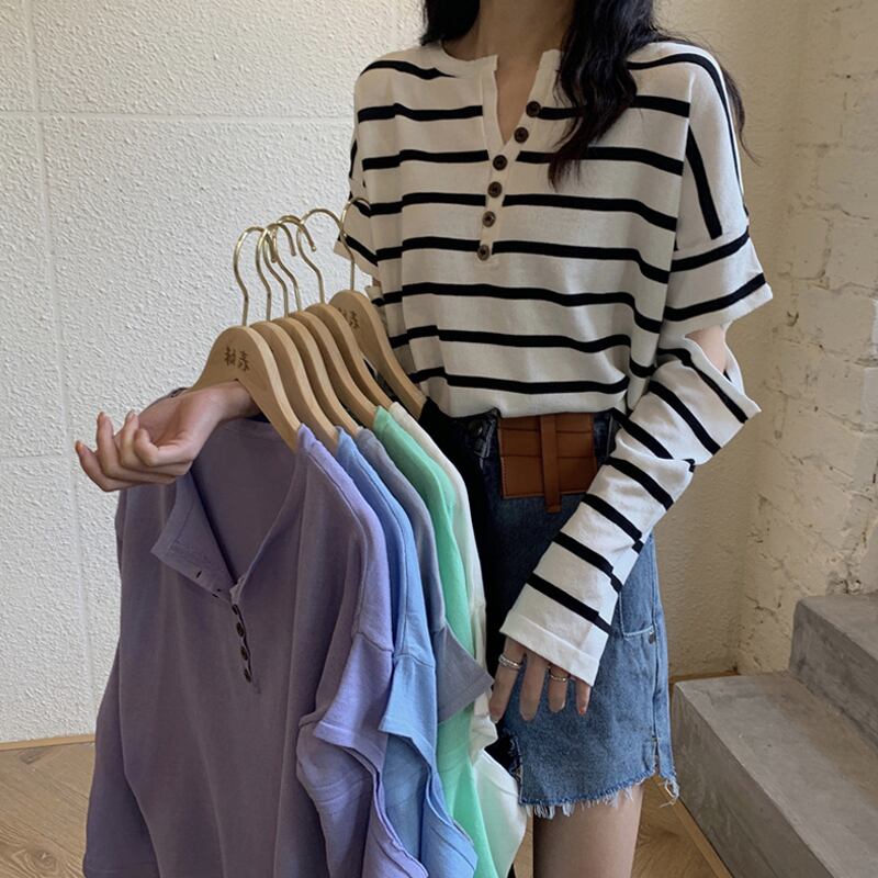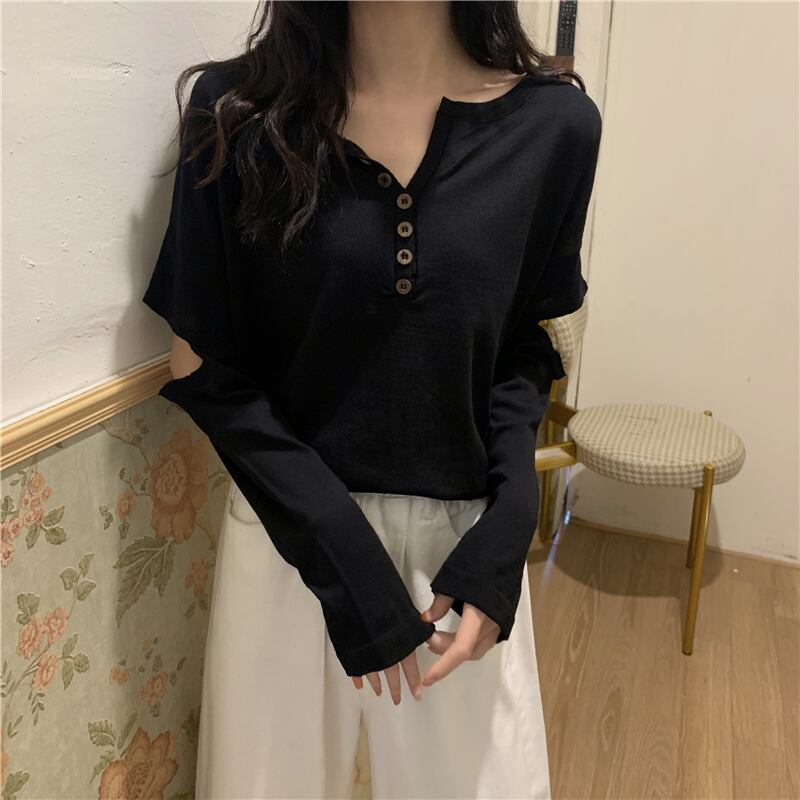 2021 最新作 Vネック長袖セーター春の新作女性とルーズ薄片の穴感トップボトシャツバージョン ロング スプリング 春物 0152801099640