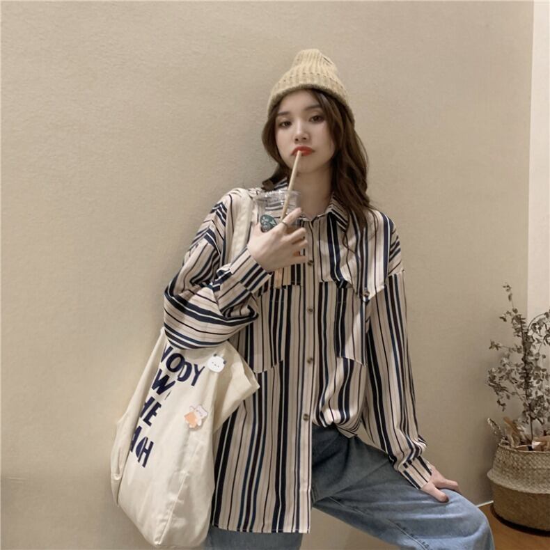 2021 最新作 レトロな香港スタイルのストライプシャツ女性2021年春新しいルーズアウターデザインセンスニッチ内側スタッキングシャツ スプリング 春物 0199620975773