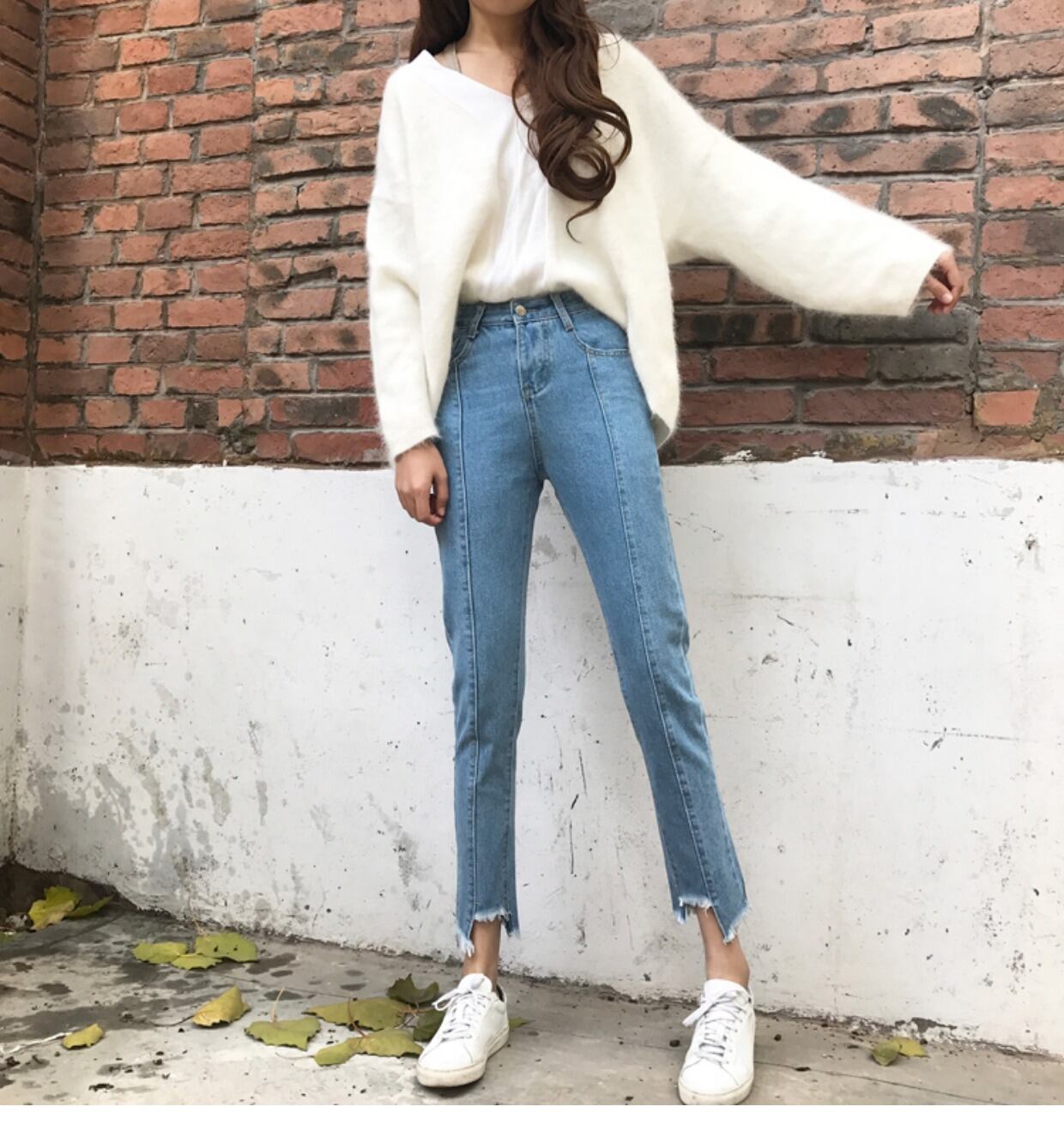 【送料無料】 春のレディーススタイルハイウエストルーズイレギュラーローエッジストレートパンツシンナインポイントパンツジーンズ学生 ハイウェスト スプリング 春物 TB1 0116652599122