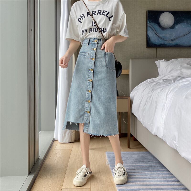 【送料無料】 股間をカバーするロングセクションのインレトロハイウエストAラインスカートと薄手のシングルブレストのイレギュラーデニムスカートの女性夏バージョン ハイウェスト サマー 夏物 TB1 0118349713220