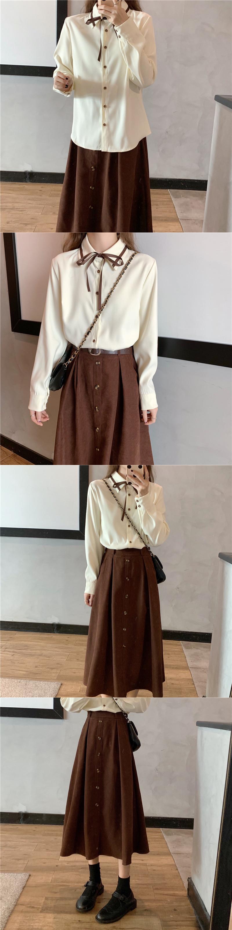 色:オフホワイトのシャツ,茶色のスカート,ストラップドレス