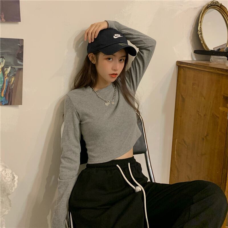 【送料無料】 スタイルの起毛長袖Tシャツ、グレーのボトミングシャツ、女性の春と秋のオールマッチの自己啓発、ハイウエストパンツ付きショートトップ ハイウェスト ロング スプリング 春物 オータム 秋物 TB1 0195443354933
