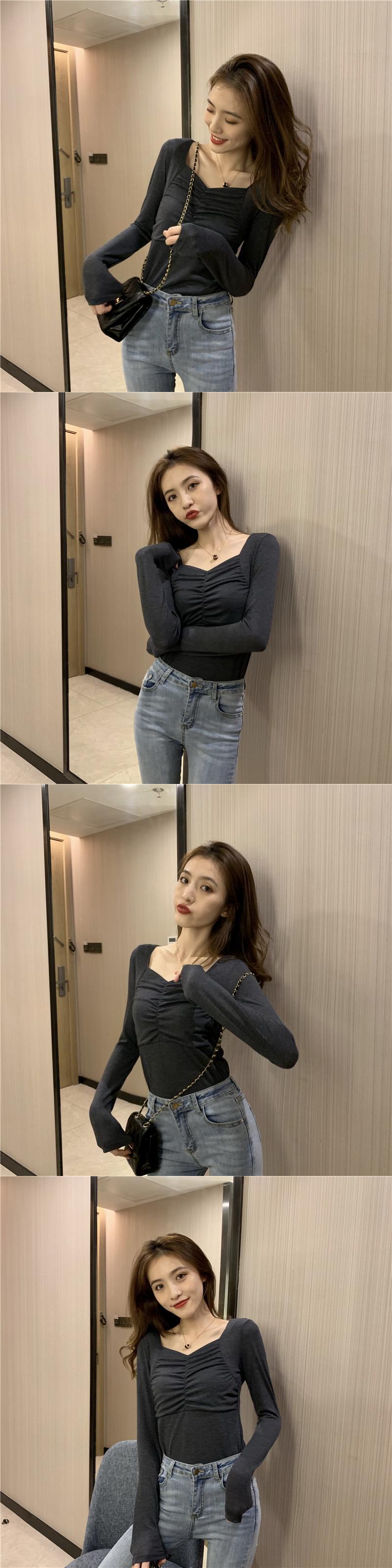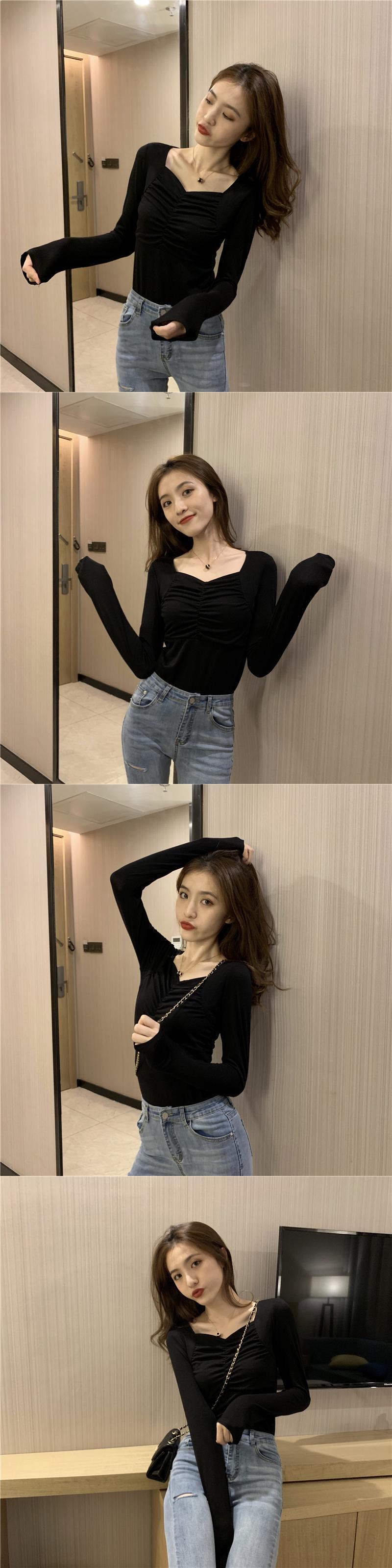 【送料無料】 スクエアネックショートトップのウエスタンスタイルの春バージョンの黒のタイトフィットボトミングシャツ女性スリムスリム長袖Tシャツ ロング ブラック スプリング 春物 スクウェア TB1 0163049403857