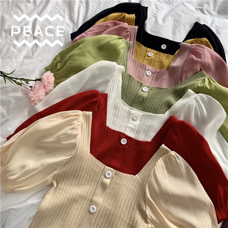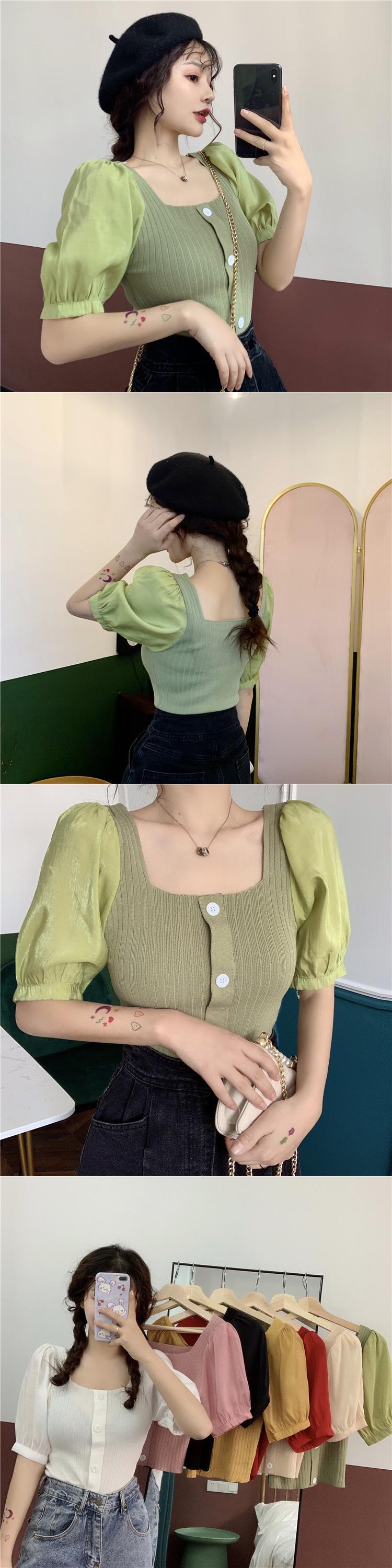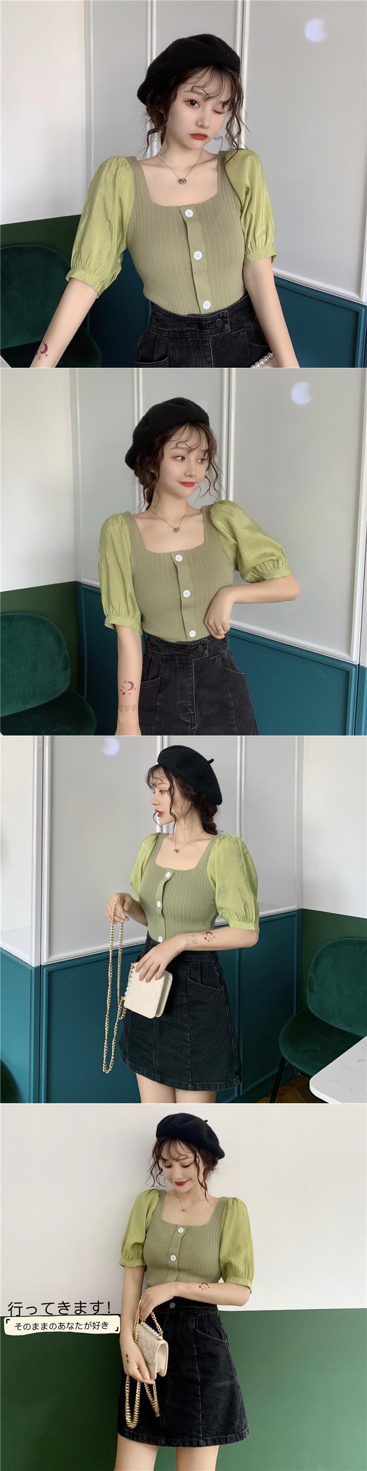 【送料無料】 カーディガン2021夏のスクエアカラー、パフスリーブアイスシルクセーターレディース半袖トップショートボトミングシャツ サマー 夏物 スクウェア TB1 017442475005