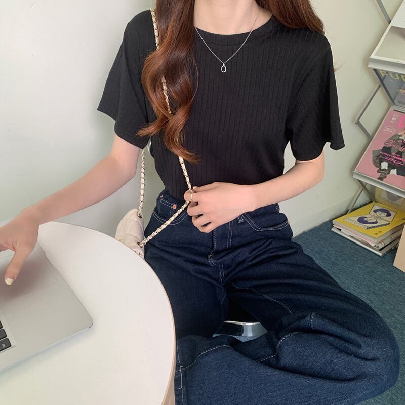 【送料無料】 ベーシックな無地のラウンドネックニットトップ、2021年夏の新しいスタイルのエインボトミングシャツ、半袖Tシャツ、婦人服 サマー 夏物 Oネック ソリッドカラー TB1 01592592197