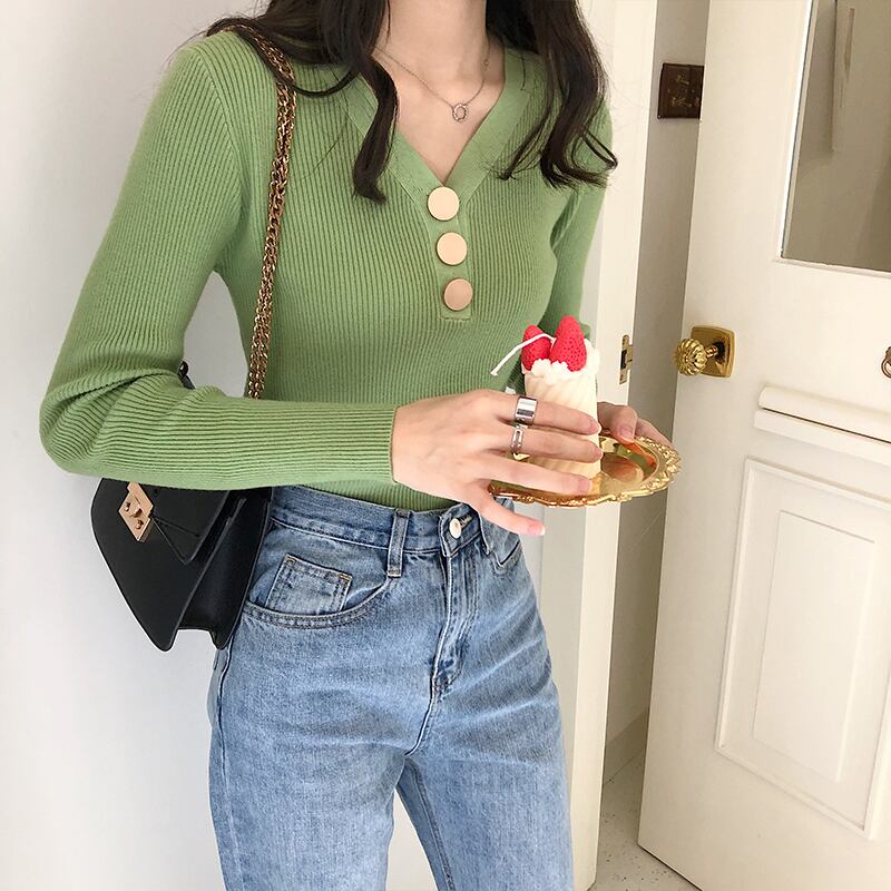 【送料無料】 春のVネックボトミングシャツレディース長袖タイトフィットブレストニットセーター鎖骨カーディガンセーター洋風トップス ロング スプリング 春物 TB1 0165590879595