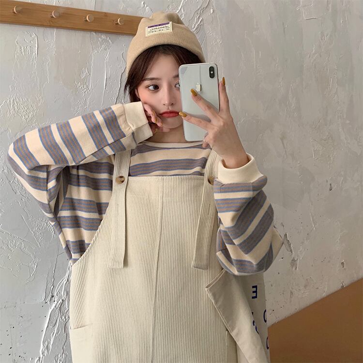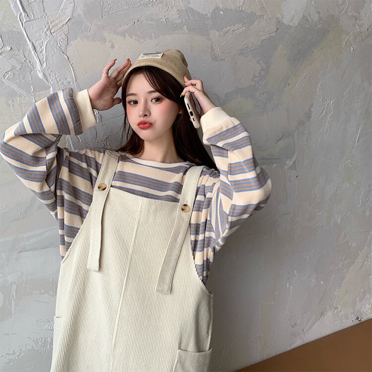 色:ブルーのストライプのセーター,オレンジのストライプのスウェットシャツ,アプリコットストラップドレス,ピンクオレンジのストラップドレス