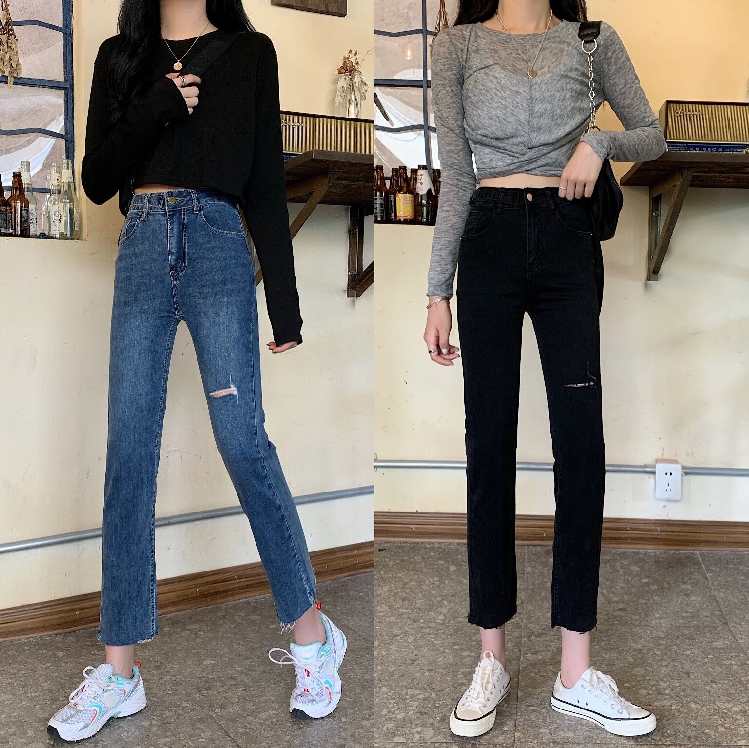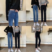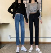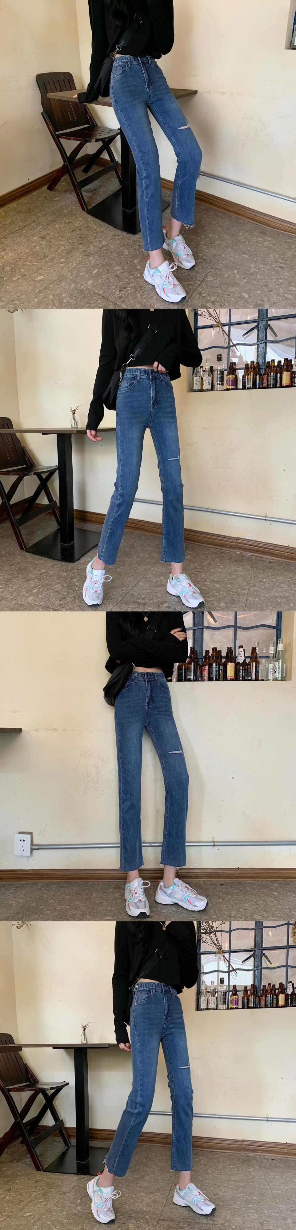 【送料無料】 ダークブルーの破れたジーンズの女性のスリムな痩身足ストレッチ9ポイントパンツ2021新しいハイウエストシガレットパンツ TB1 0180791565572