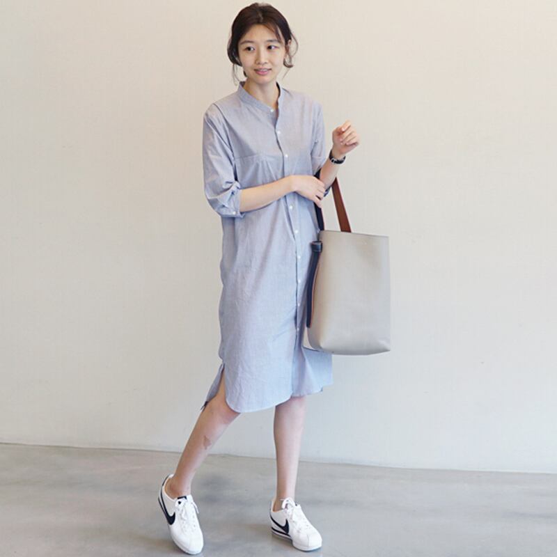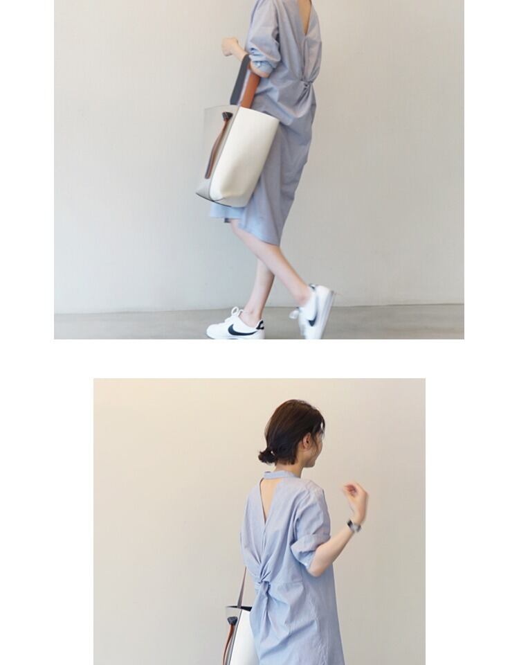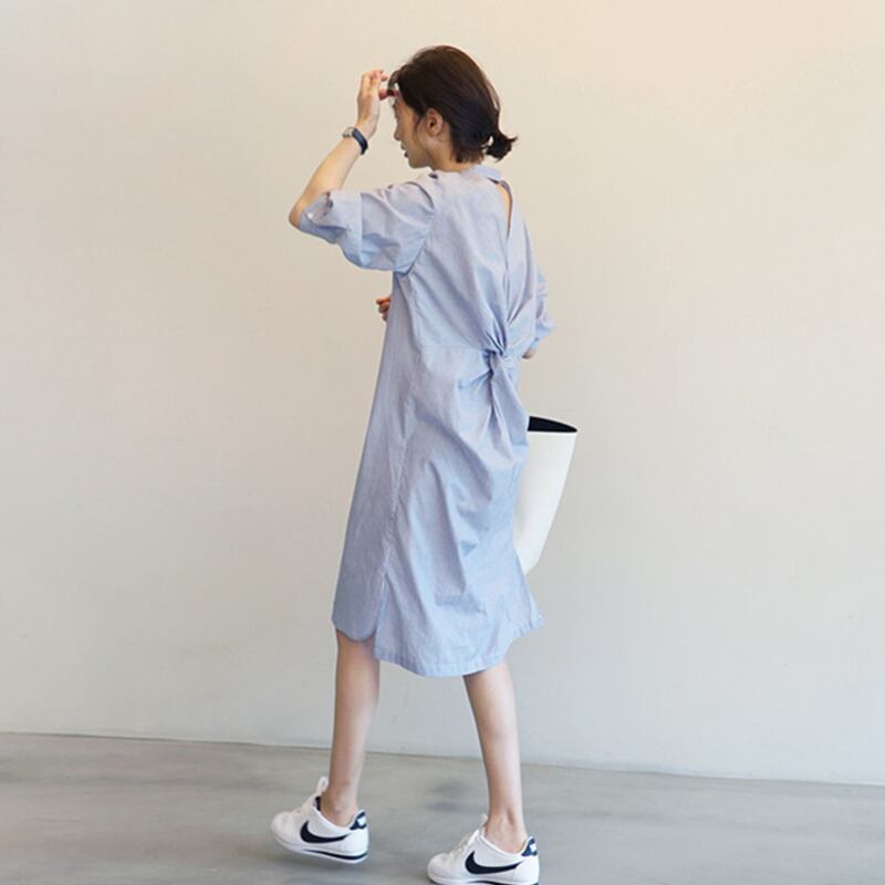 スタイルスタンドアップカラールーズホローオープンバックシャツスカート女性夏ミドル丈青と白のストライプスリーブシャツドレス ホワイト ブルー サマー 夏物 TB2-3 TB2-382701816315