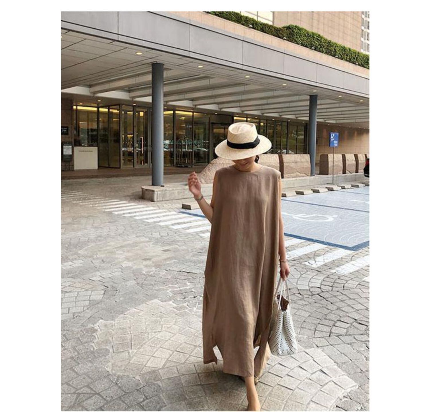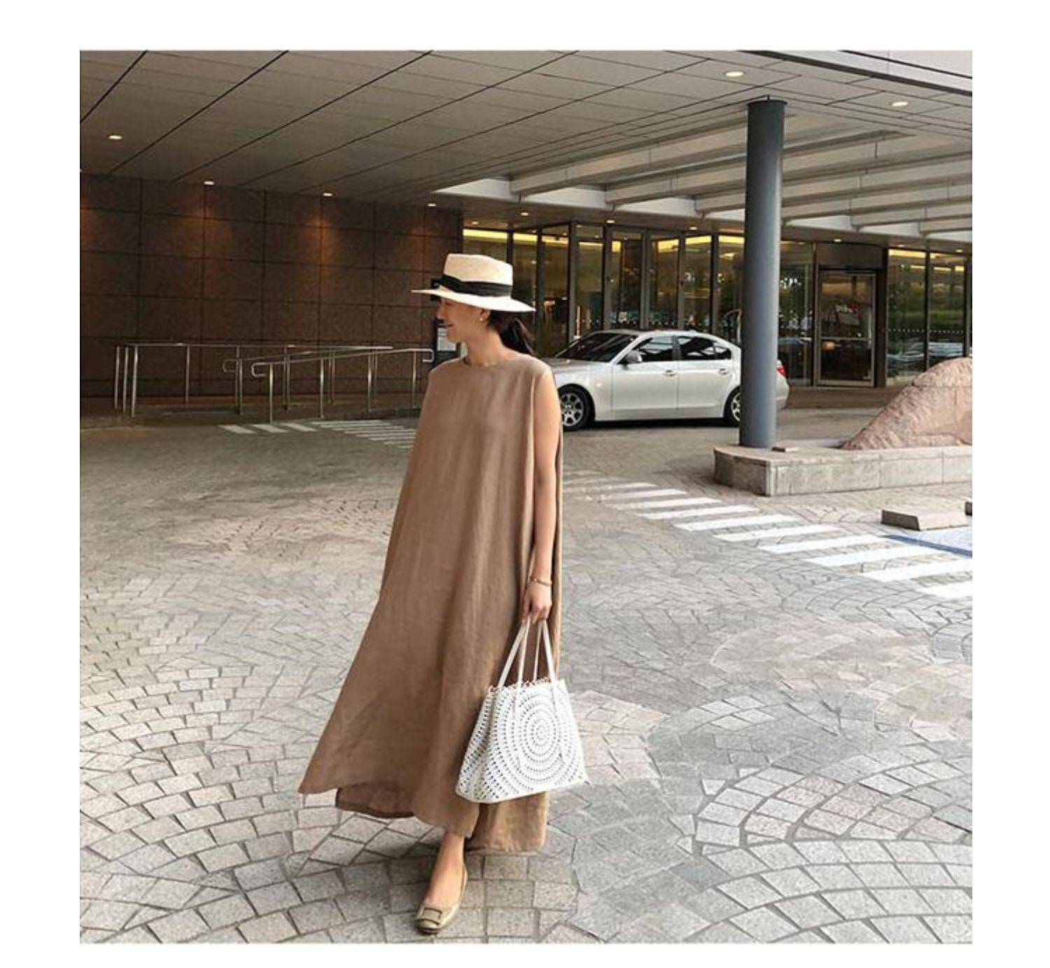 2021年春夏レディースラウンドネックノースリーブベストルーズラージサイズロングスカートビッグフォールドポケットコットンリネンワンピース 大きめサイズ スプリング 春物 サマー 夏物 Oネック TB2-3 TB2-354527030405