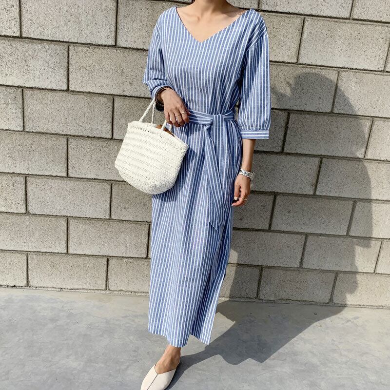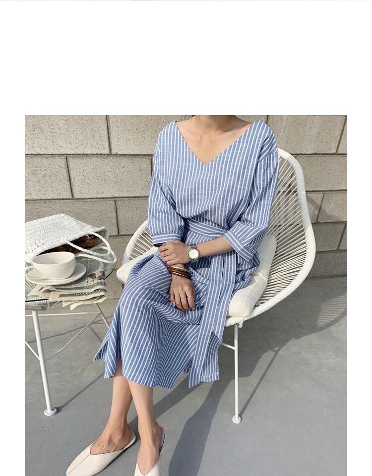 2021年夏のインレトロVネック縦縞包帯ウエスト薄気質綿とリネンロングスカートドレス女性 コットン サマー 夏物 ストライプ TB2-3 TB2-32852695969