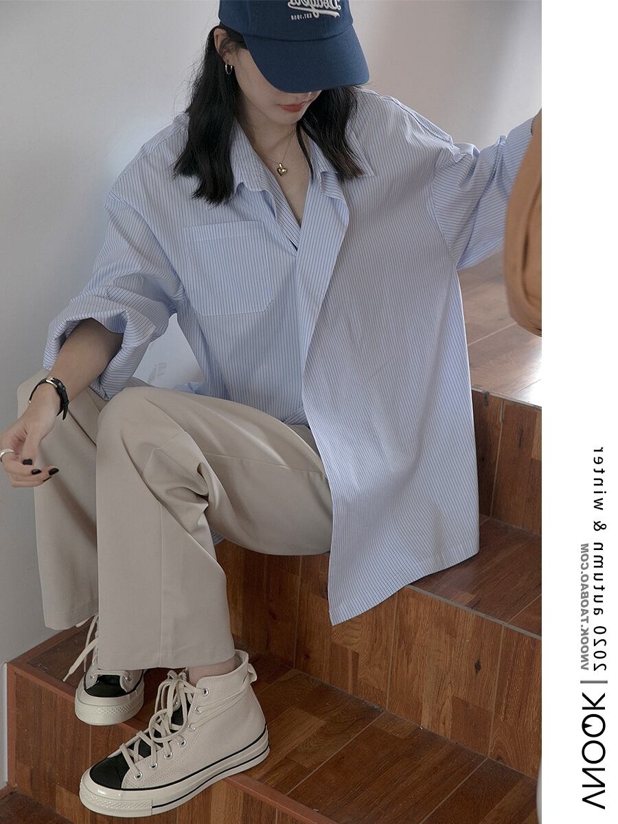 2021年春の新作ブルーストライプシャツ女性デザインセンスニッチルーズカジュアルオールマッチワンボタン長袖シャツ ロング スプリング 春物 TB2-3 TB2-358793394613