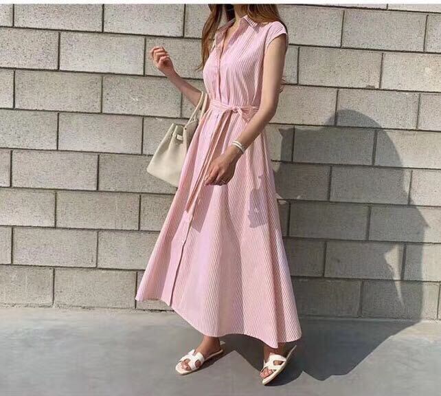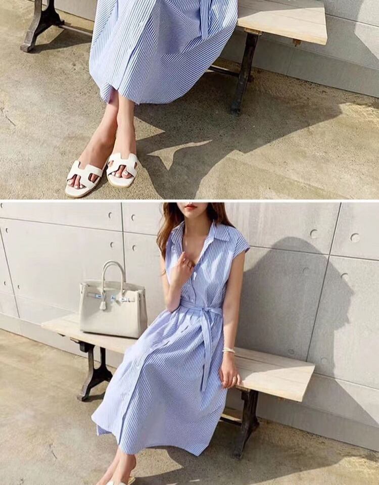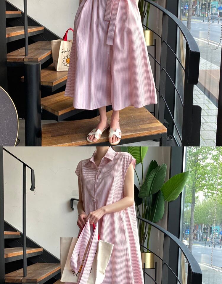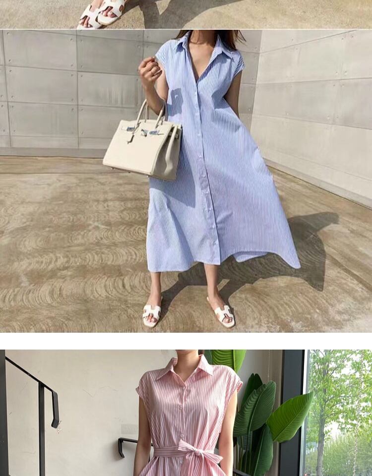2020年夏の縦縞ノースリーブシャツドレス女性シングルブレストレースアップポロカラーミディドレス サマー 夏物 ストライプ TB2-3 TB2-397372335453