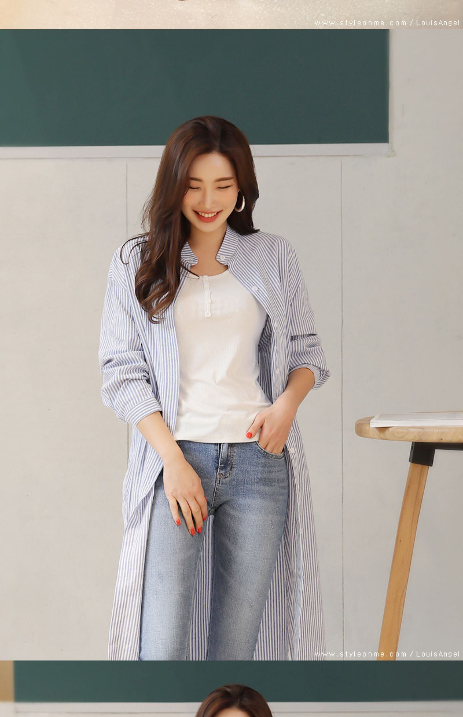 2021年春新作原宿ストライプシャツスカートレディース長袖スタンドカラールーズスリミングブラウスミドル丈オーバーザニーシャツ ロング かわいい スプリング 春物 TB2-3 TB2-324108038064