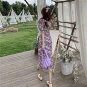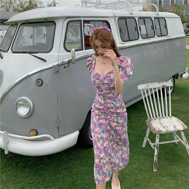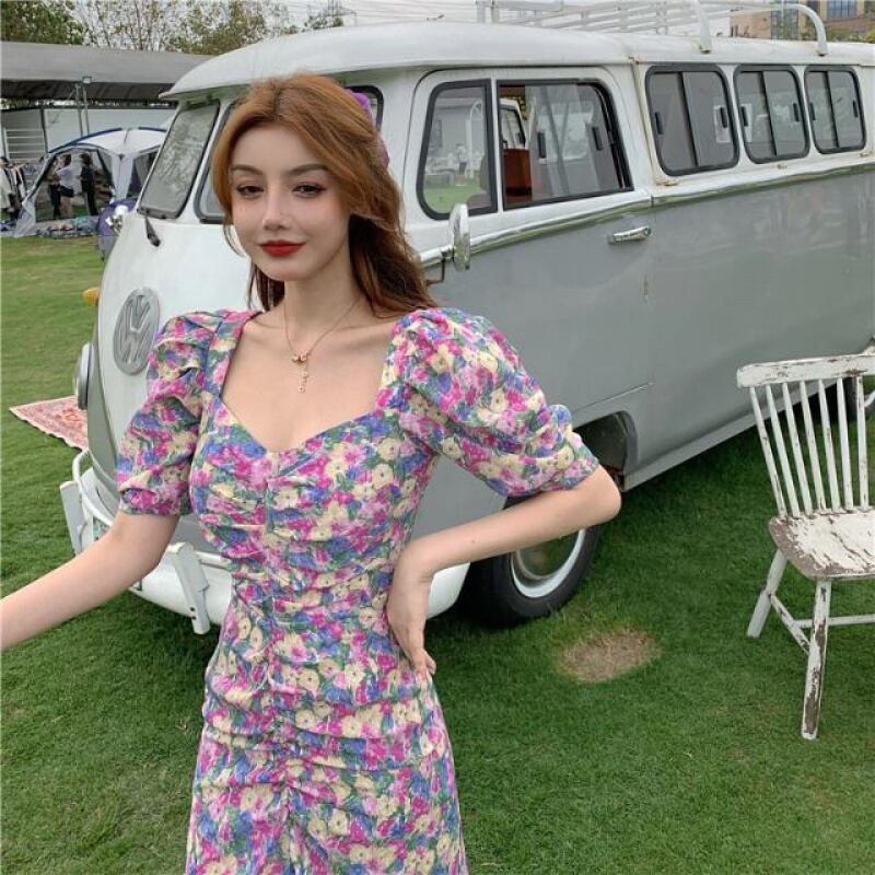 スクエアカラーウエストは薄いフレンチパフスリーブミドル丈気質スカート夏レトロパープルフローラルドレス女性 サマー 夏物 花柄 スクウェア TB2-5 TB2-553992684