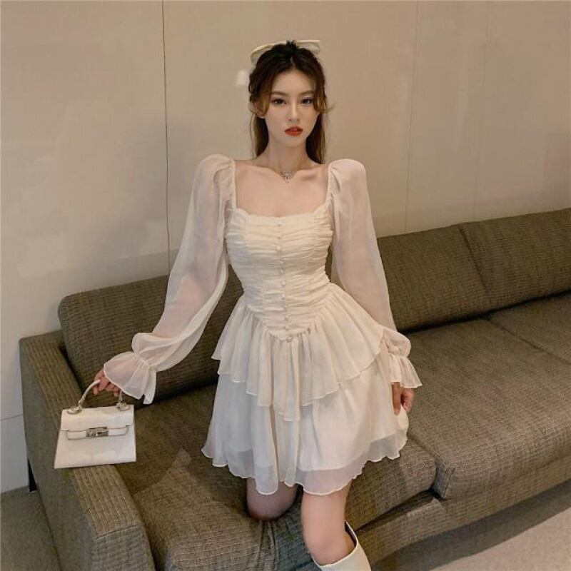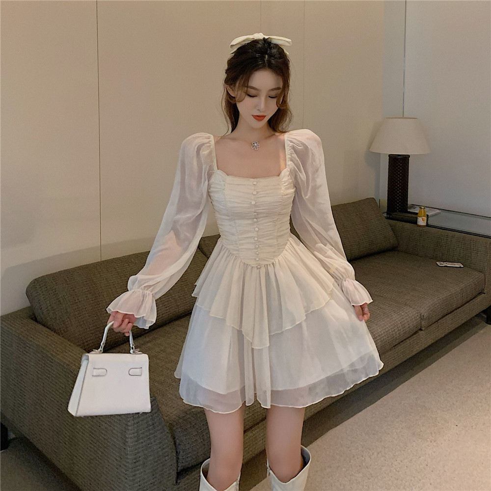 ピュアデザインズ香港スタイルのスクエアカラーシフォン長袖プリーツハイウエストフリルイレギュラースーパーフェアリードレス春秋 ハイウェスト ロング スプリング 春物 オータム 秋物 スクウェア TB2-5 TB2-532423394104