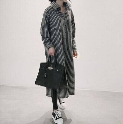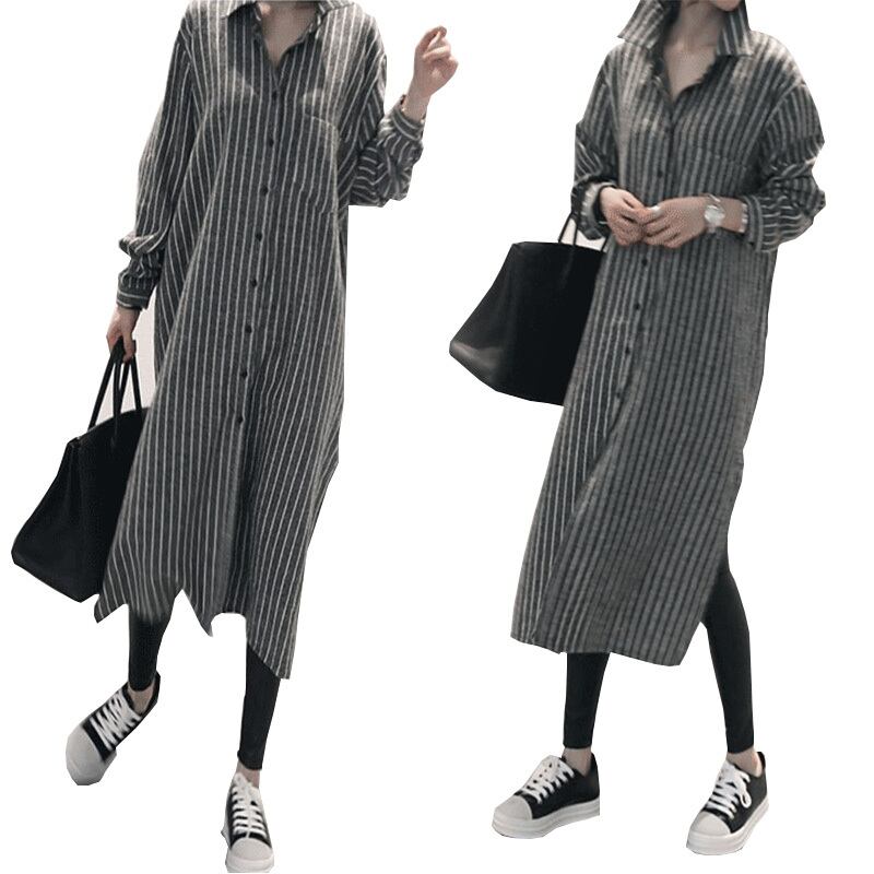 ミッドレングスのストライプのシャツジャケットの女性は、シャツのスカートの外側にリネンコットンリネンラージバージョンの長袖ルーズバージョンを春に ロング スプリング 春物 TB2-3 TB2-326333247919