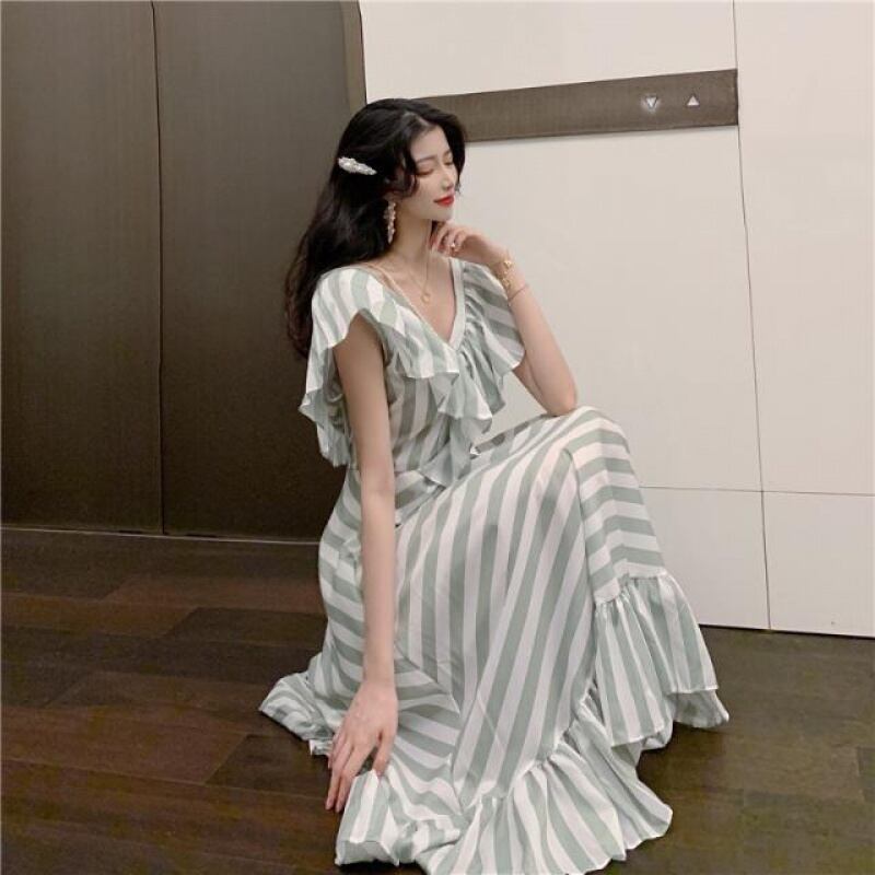 トラベルホリデースタイル香港フレーバー蓮の葉ルーズストライプロングスカートエレガントレトロフレンチVネックワンピーストレンド TB2-5 TB2-542079284081