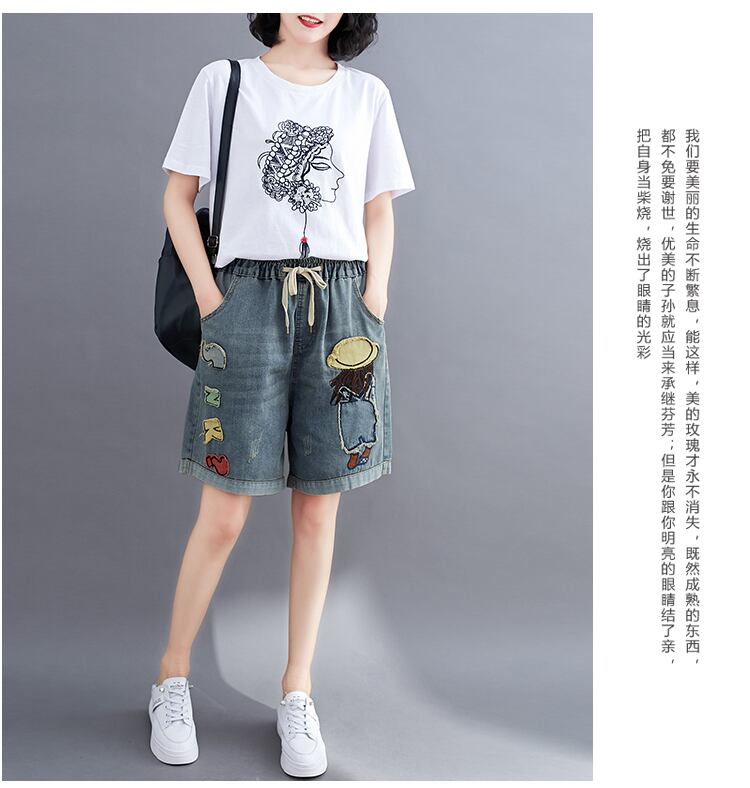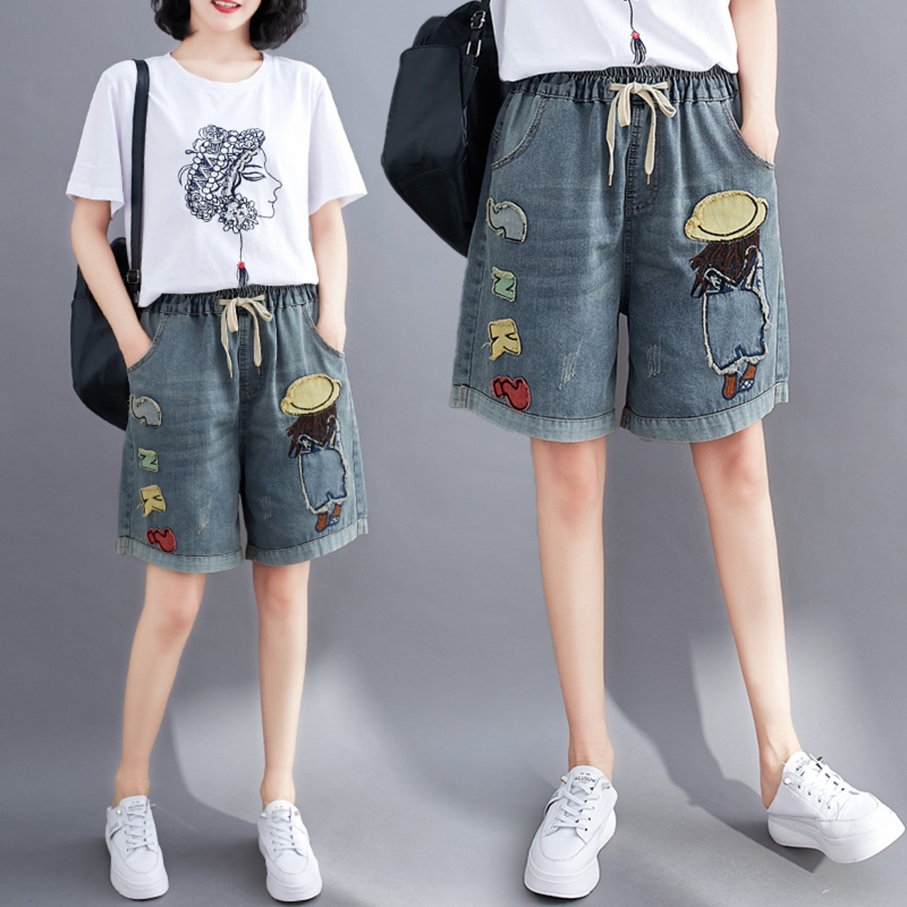 2020年夏の新作漫画ワッペン刺繍デニムショーツ女性ハイウエストシンワイドレッグ5点ルーズストレートレッグパンツ レッド サマー 夏物 ブルマー TB2-8 TB1192576121683