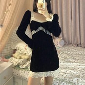 ソルトレトロシックスウィートクールプリンセスドレスゴールドベルベット長袖リトルブラックドレススクエアカラーレースショートスカート春秋 ロング 大人ガーリー キュート カジュアル スプリング 春物 オータム 秋物 スクウェア TB2-5 TB2-539606080888