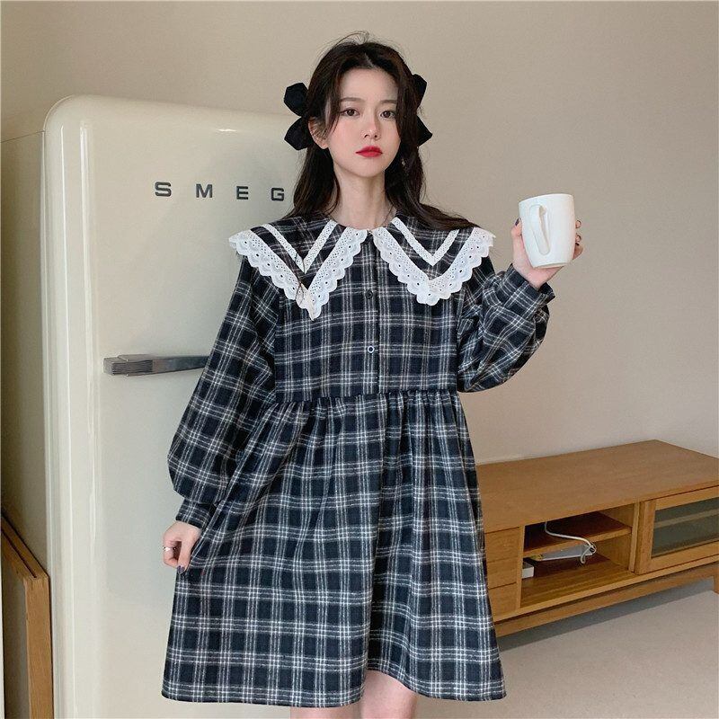 eseレトロインタイドチェック柄ドールスカートカレッジスタイル長袖ルーズレースワンピース春秋バージョン ロング スプリング 春物 オータム 秋物 TB2-5 TB2-591419215534