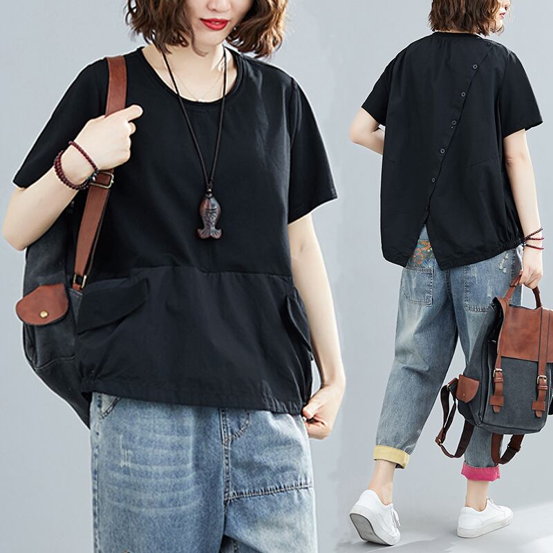 太いウエストと腹を覆うトップス、女性のルーズ、ラージサイズ、薄い、背中の斜めのボタン付きTシャツ、サマードレス、新しい2021年の太った女性 大きめサイズ 夏物 TB2-244491808978