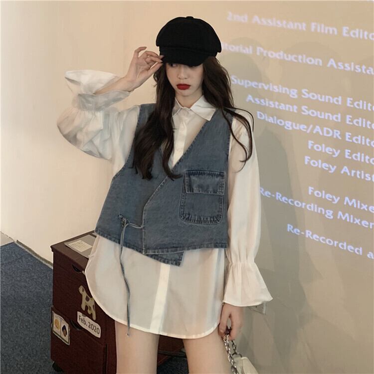 Vネックデニムベストレディース春秋ルーズスタイルチョッキノースリーブ折りたたみ式レースアップブラウスショートスタイルアウターベストタイド スプリング 春物 オータム 秋物 TB2 TB230670153245