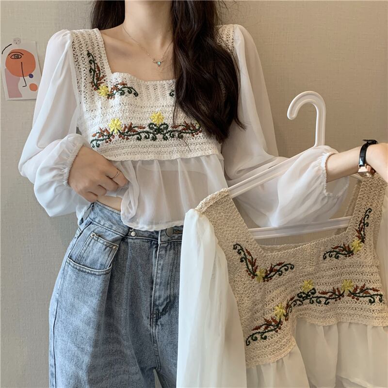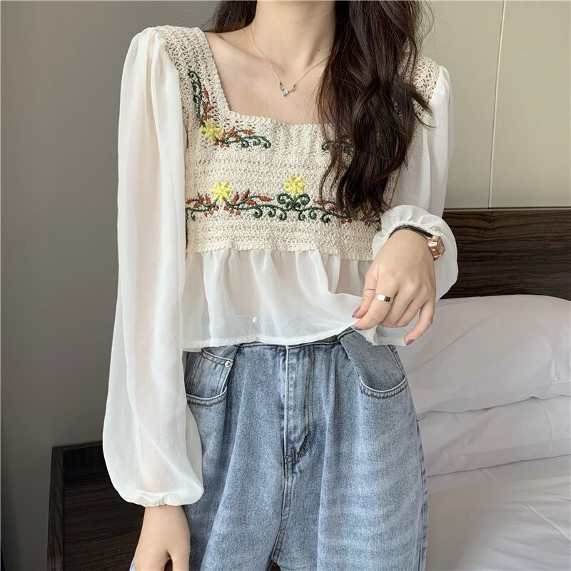 女性の2021年の新しい春の気質ブラウスフレンチレース中空スクエアネックパフスリーブシフォン長袖シャツ ロング スプリング 春物 スクウェア TB2 TB287232861534