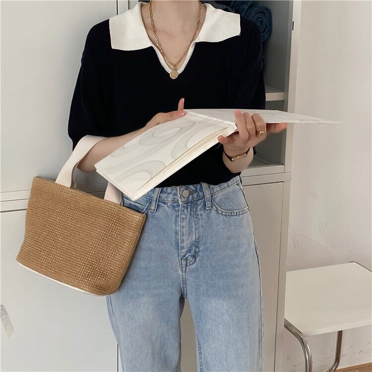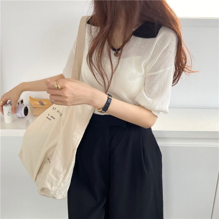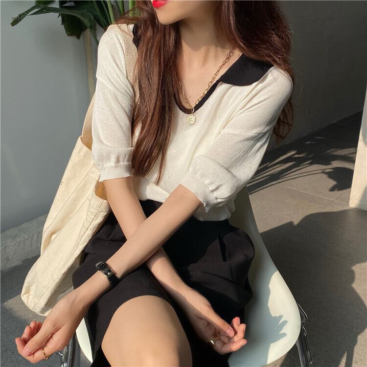 insスーパーファイヤーレトロカジュアルワイルドルーズVネック半袖ヒットカラーポロシャツアイスシルクニットTシャツトップ女性夏 サマー 夏物 TB2 TB246804324836