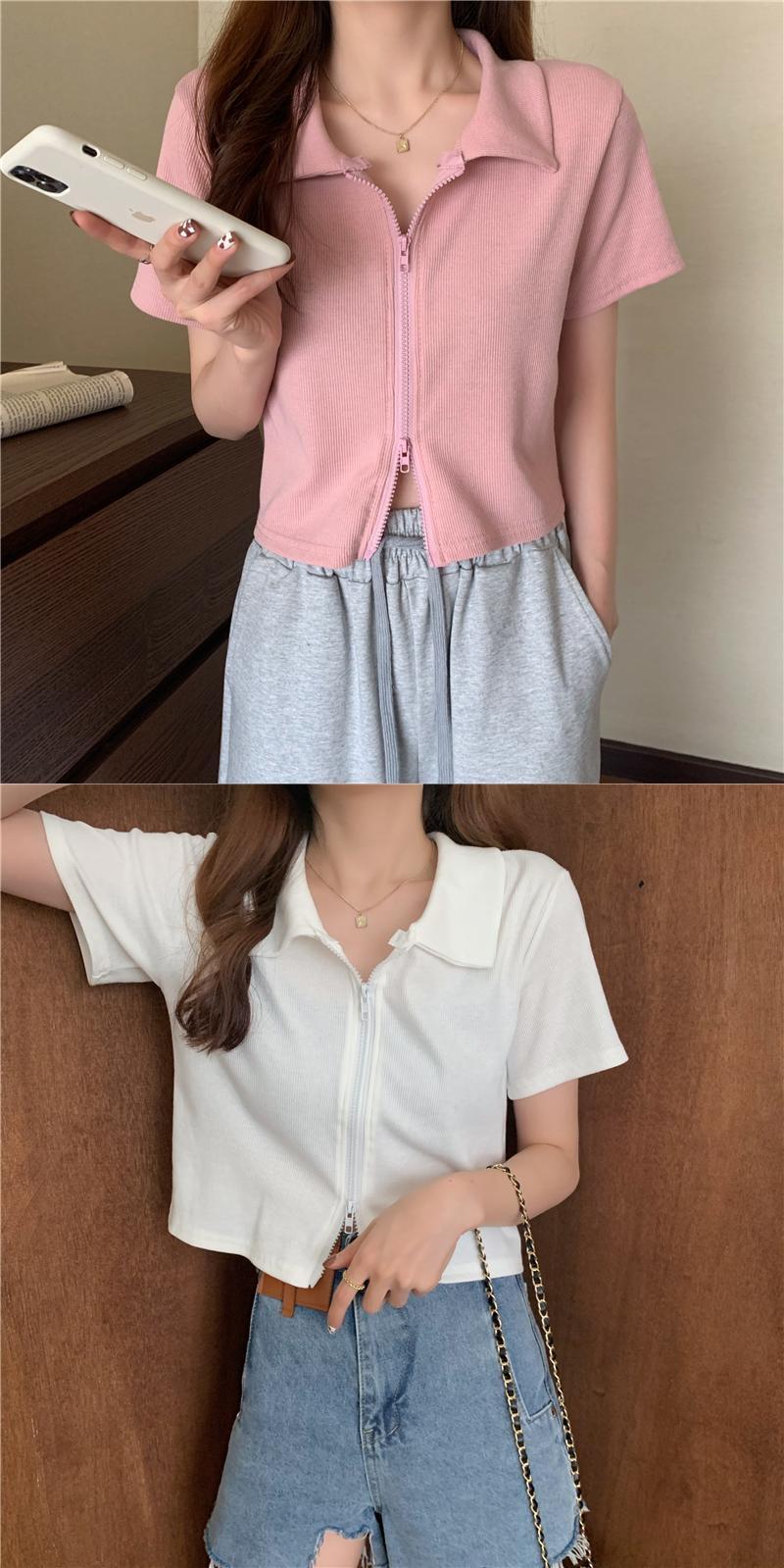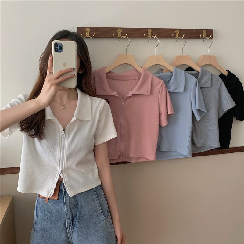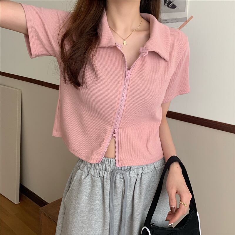 ピンクのポロシャツ半袖Tシャツ女性の夏の自己栽培ハイウエストダブルジッパー露出アンビリカルショートbmトップデザインセンスインズタイド ハイウェスト サマー 夏物 TB2 TB264148516377