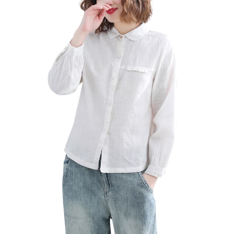 プラスサイズの女性の2019年春の新しい文学的な小さな新鮮な綿とリネンのシャツの女性は無地の野生の長袖トップを緩めます ロング コットン 大きめサイズ スプリング 春物 ソリッドカラー TB2-8 TB2-854020100025