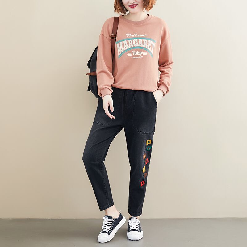 2019秋冬新バージョンのラージサイズレター刺繍ジーンズレディースカジュアルオールマッチ伸縮性ウエストハーレムパンツ エラスティック 大きめサイズ オータム 秋物 ウィンター 冬物 TB2-8 TB2-835076137422
