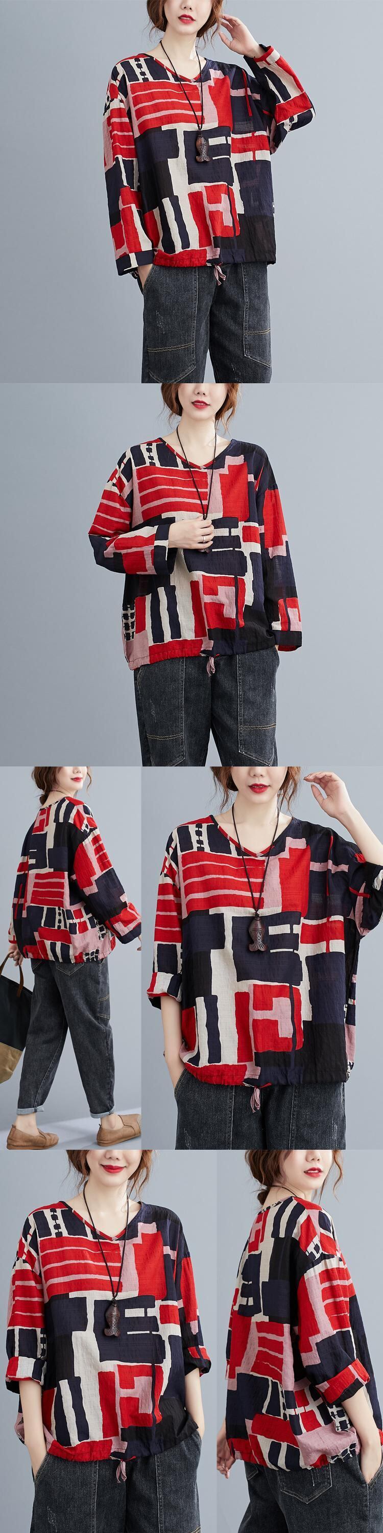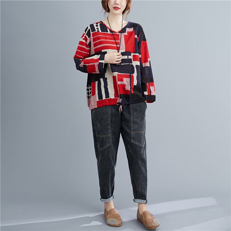 レトロヒットカラープリントVネックブラウスルーズプラスサイズファットMMカジュアルエイジリダクションTシャツレディース 大きめサイズ TB2-8 TB2-885665416580