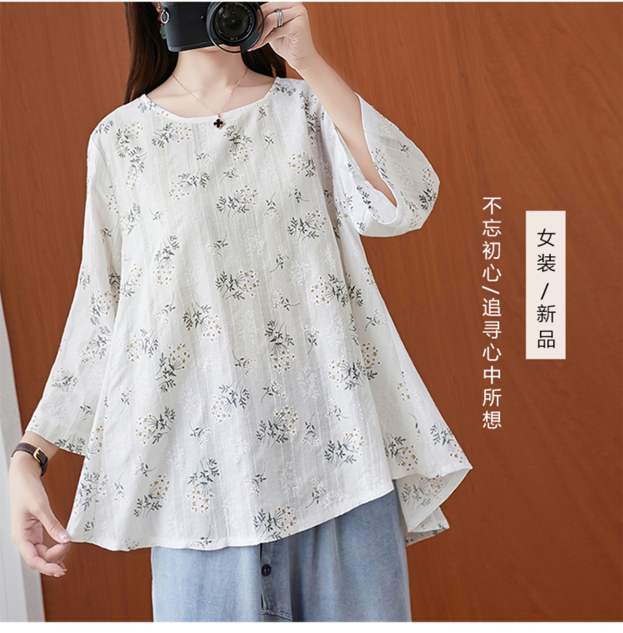 2020年初秋文学とアート大サイズのルーズで薄い綿とリネンの小さな新鮮な七分袖Tシャツレディーストップ コットン 大きめサイズ オータム 秋物 TB2-8 TB2-875673145646