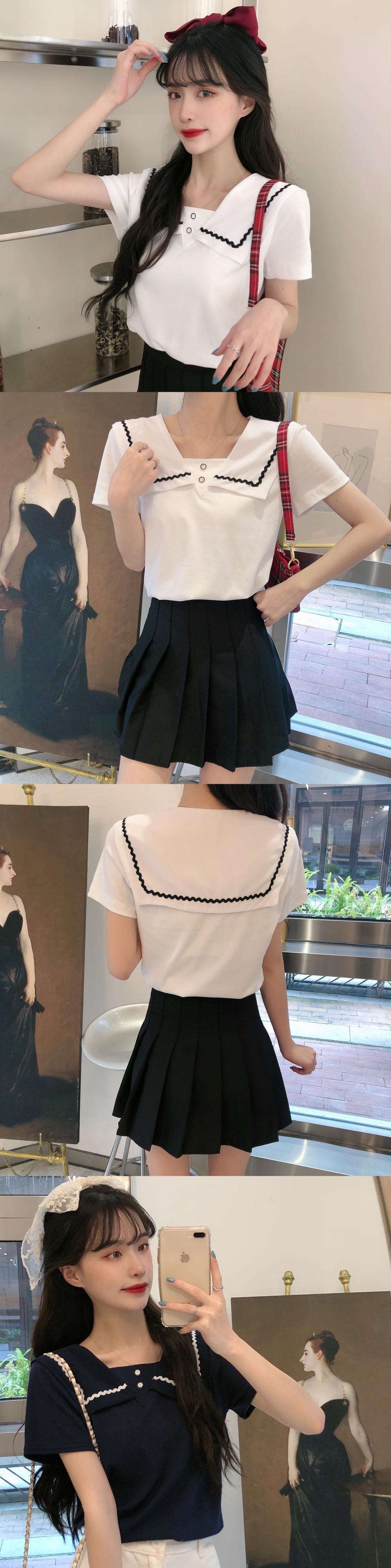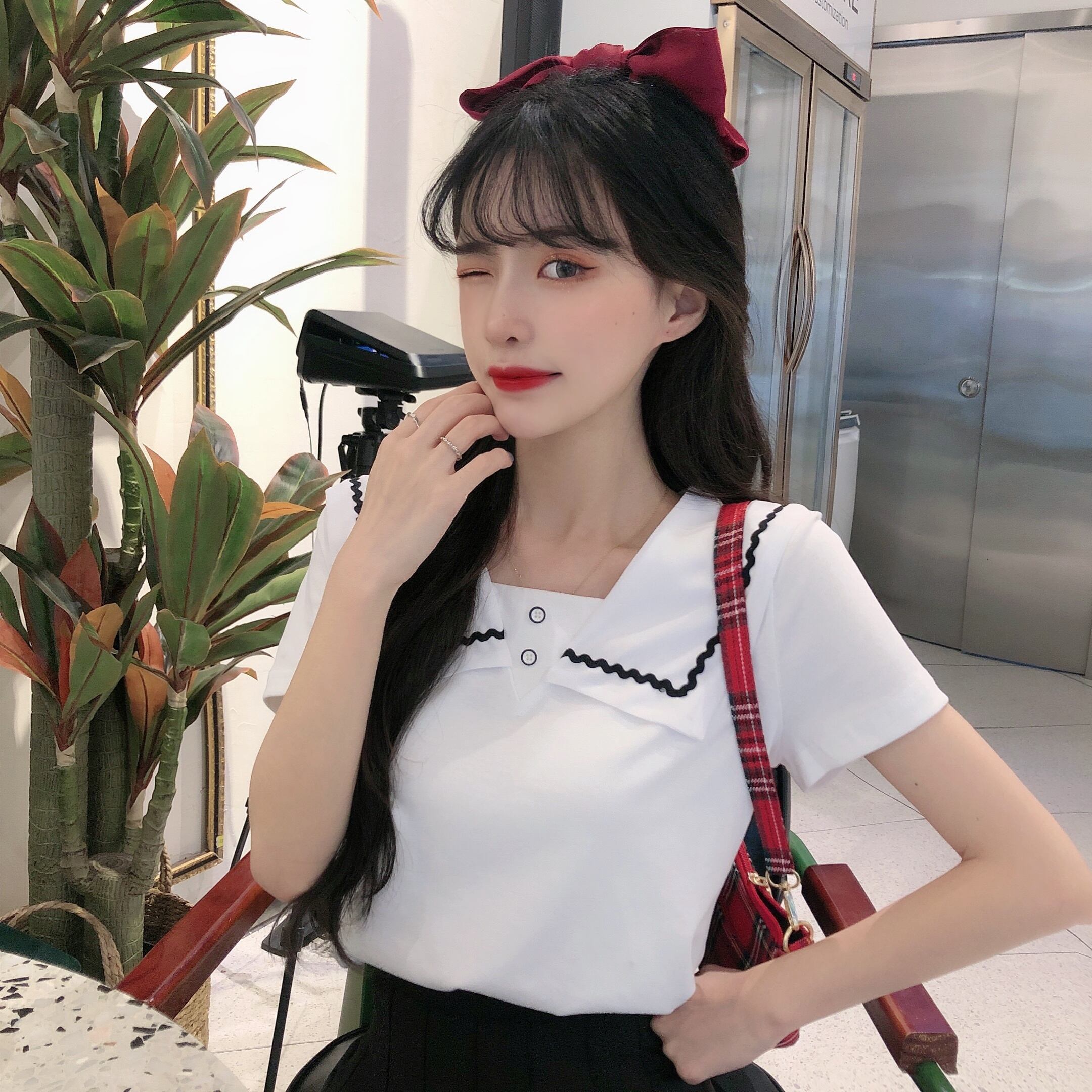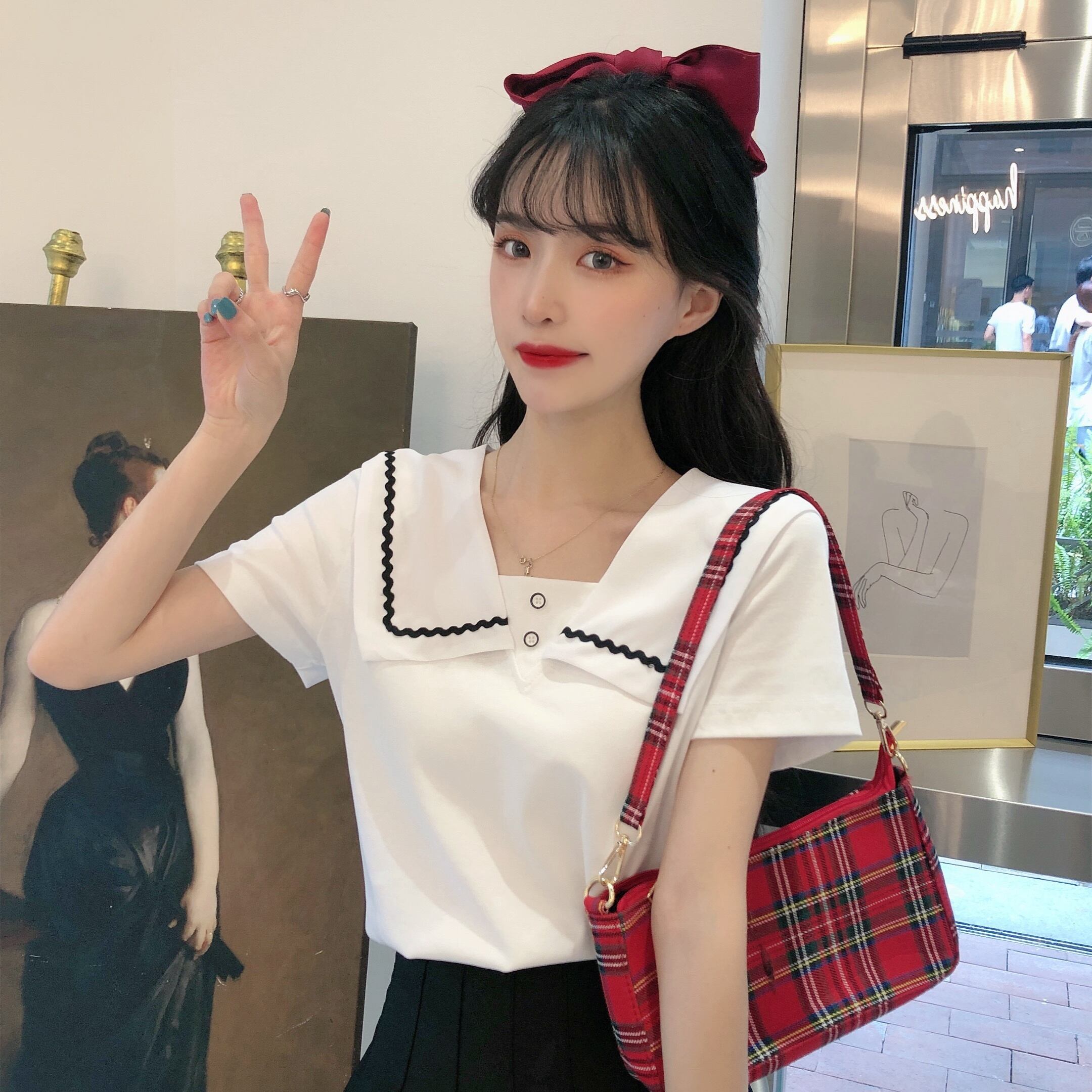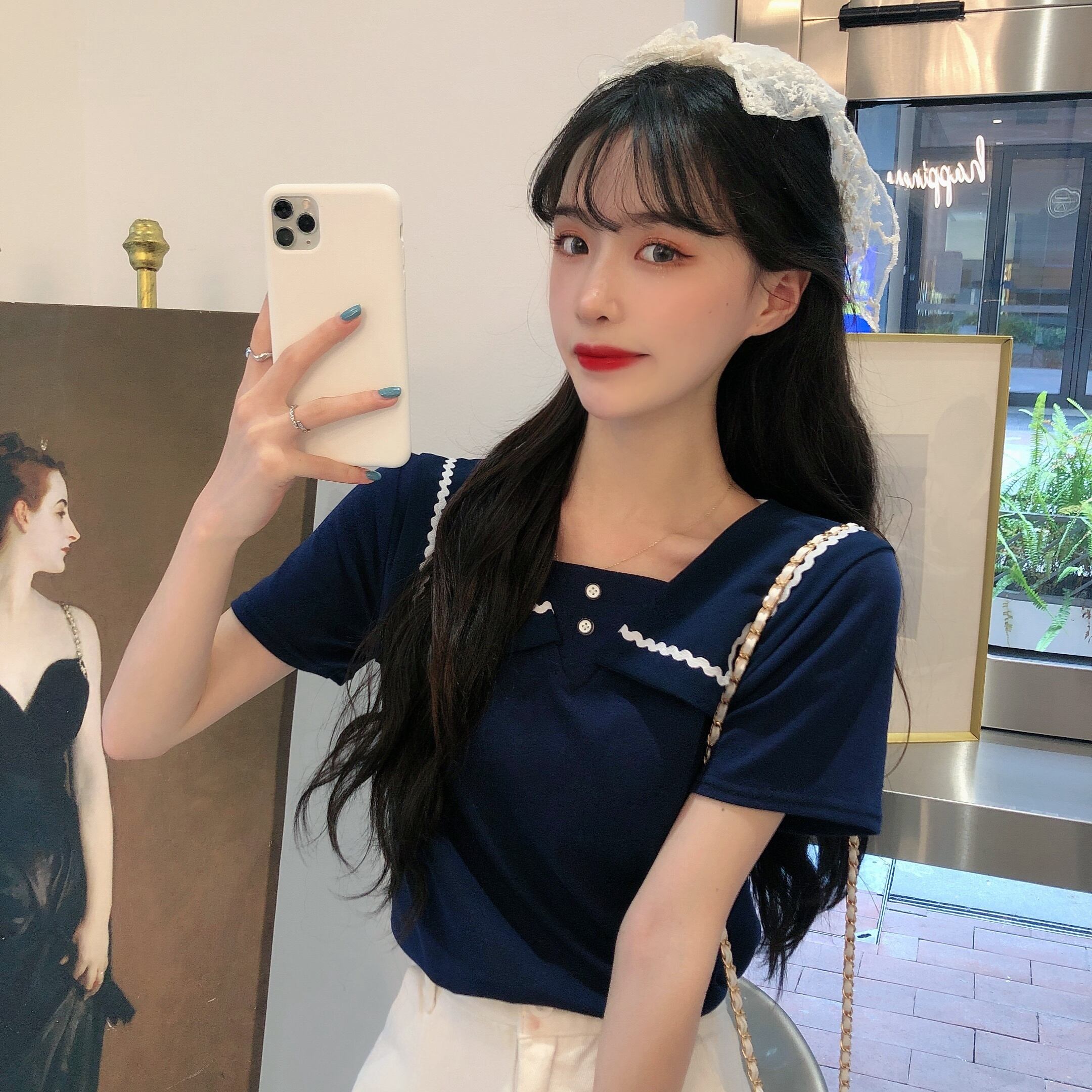 ネットレッドデザインドールネイビーカラーホワイト半袖Tシャツ女性インスーパーファイアー学生夏ハイウエストショートトップ ハイウェスト サマー 夏物 TB2 TB268286447758