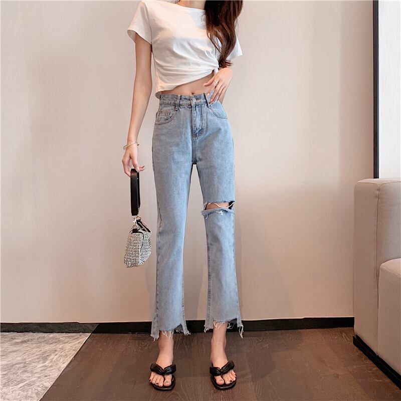 不規則な生のエッジと穴、まっすぐな9ポイントの古いパパパンツ、女性のハイウエスト、ルーズで薄いデニム乞食ワイドレッグパンツ、夏 ハイウェスト サマー 夏物 ワイドパンツ TB2 TB230769661252
