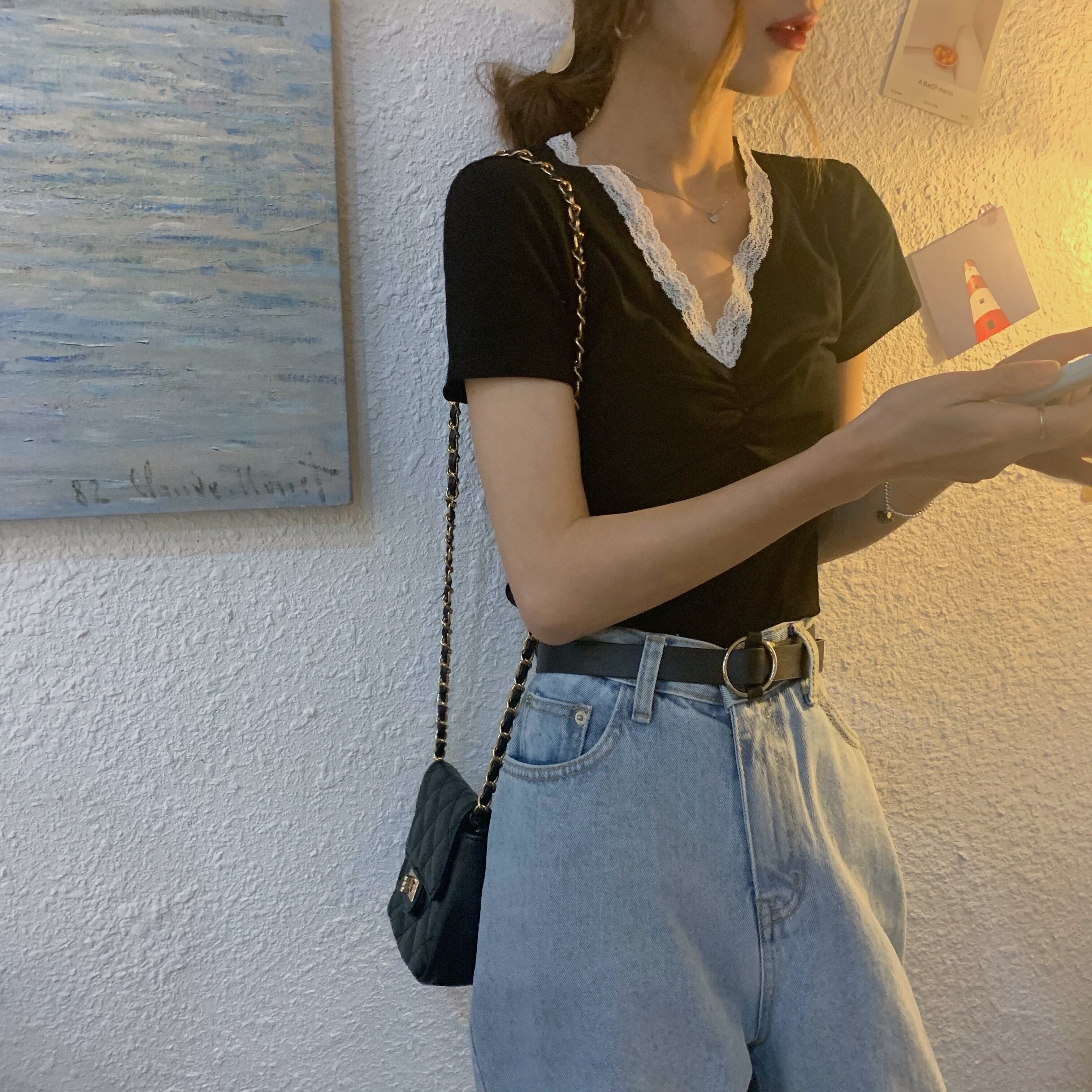 小さなネットの赤いシャツ2021年の新しい夏バージョンの黒人女性のデザインセンス気質Vネックニッチ半袖Tシャツ レッド ブラック サマー 夏物 TB2 TB287799256581
