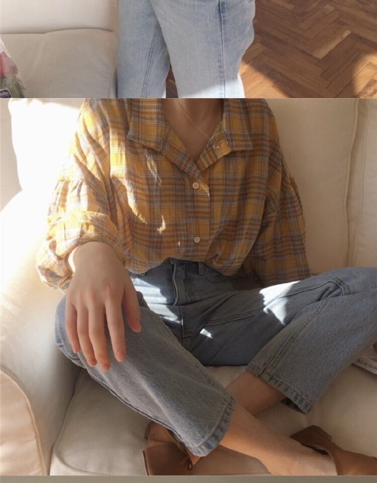 ins活力ワイルドレトロチェック柄長袖デザインセンスシングルブレストラペルシャツブラウス秋 ロング オータム 秋物 TB2-3 TB2-351905212950